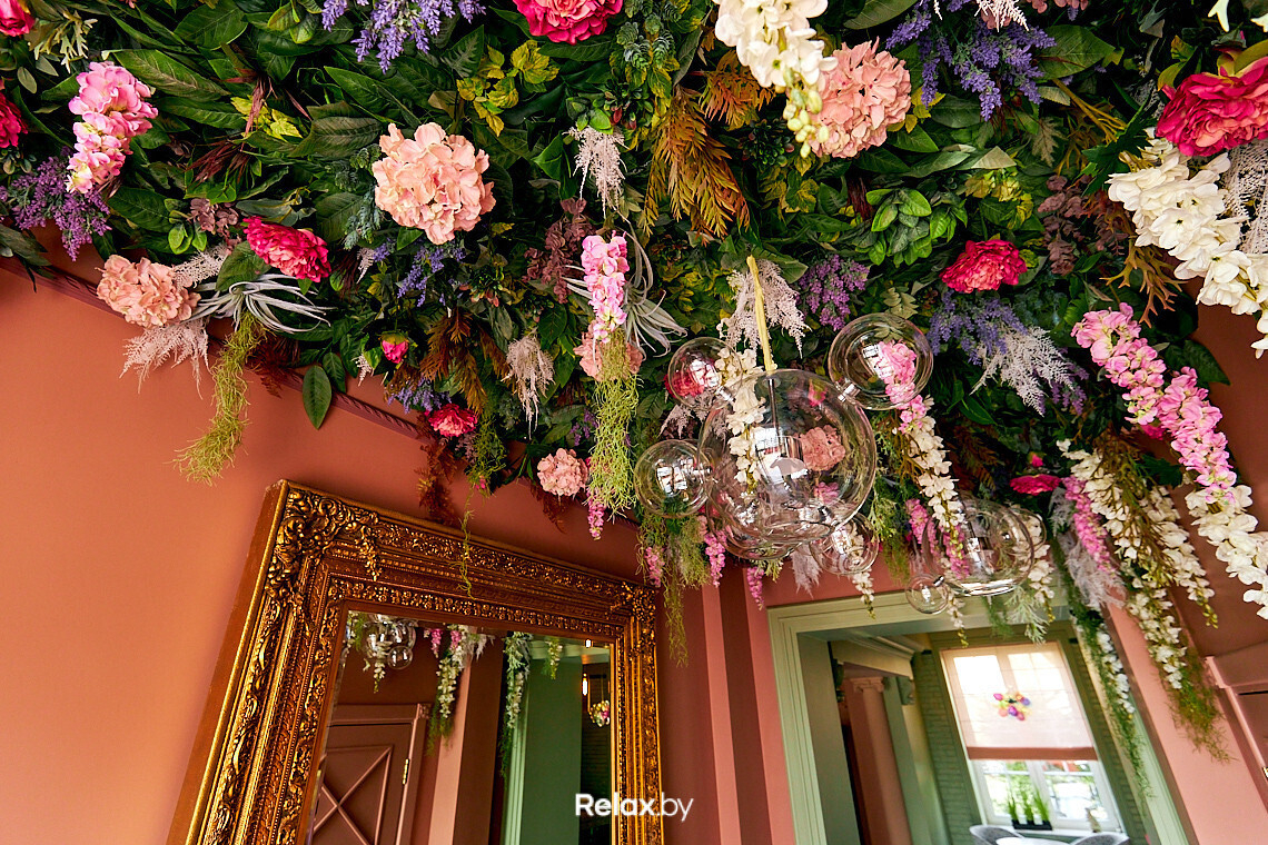 Интерьер получился максимально инстаграмным. Один из самых ярких элементов декора — композиция из цветов на потолке. Ключевые тона в залах — оттенки фисташкового и лососевого. В выходные дни рекомендуем заранее бронировать столик у панорамных окон.
