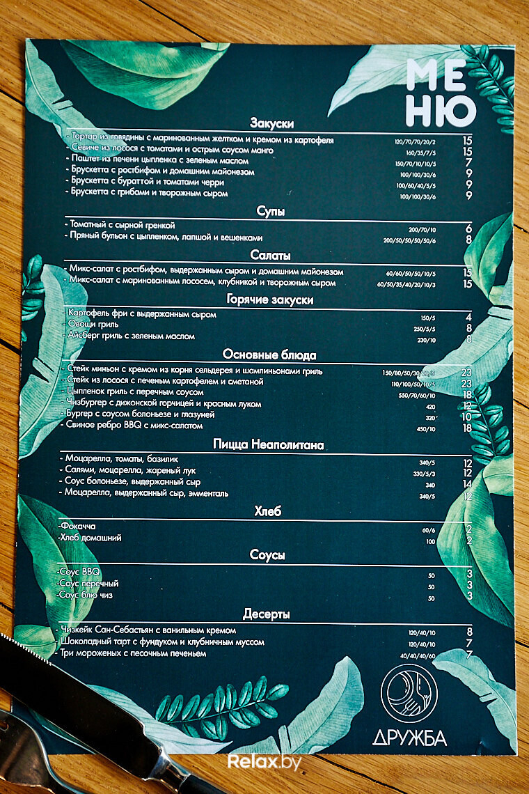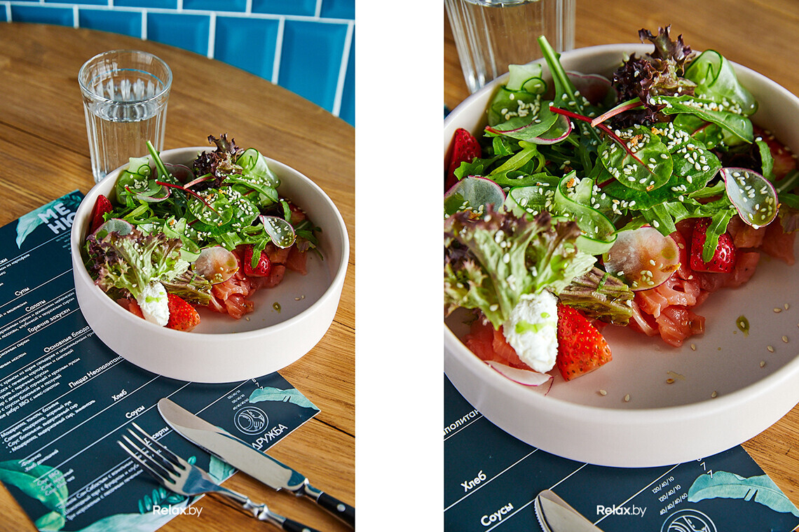 Сегодня в заведении выбран курс на классические блюда, но в авторской интерпретации и по приемлемым ценам. Готовить обещают из сезонных овощей, а обновлять меню в зависимости от пожеланий и потребностей гостей. Так, например, вскоре в «Дружбе» появятся поздние завтраки и специальное обеденное меню. Обновление ожидается и среди основных позиций: в кафе планируют начать готовить пасту собственного производства.