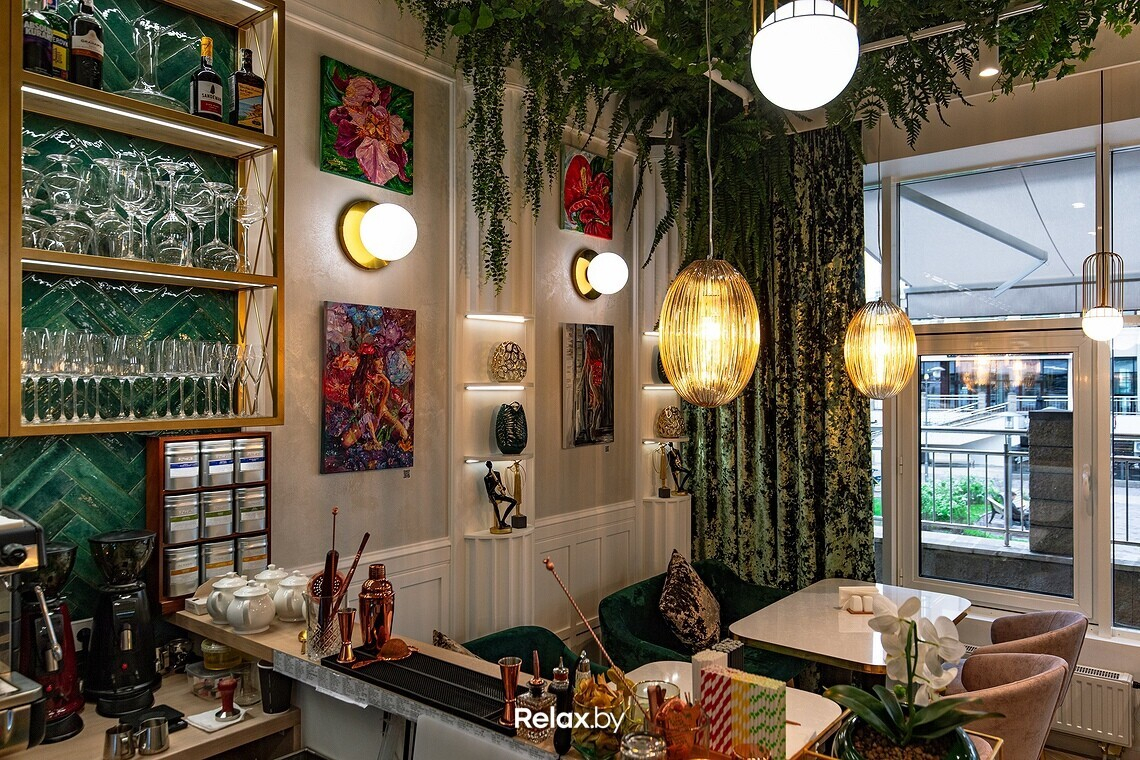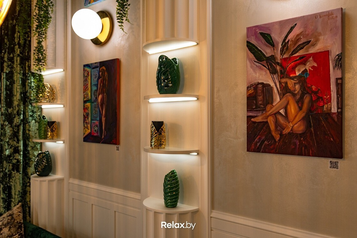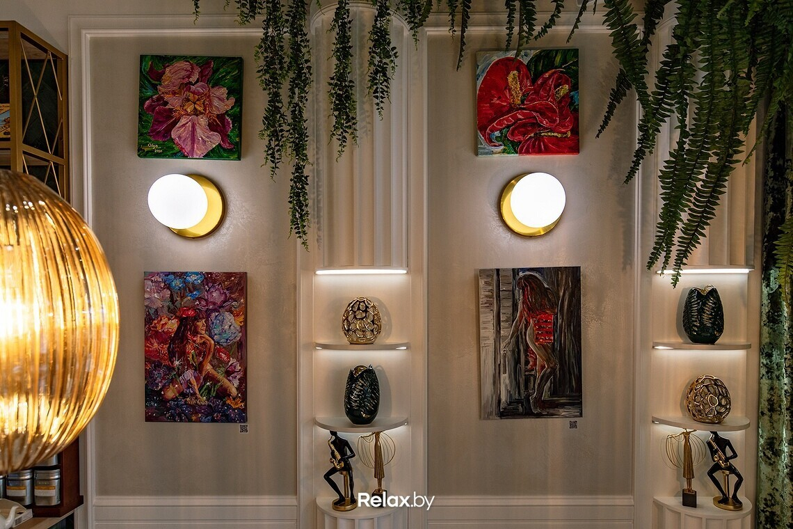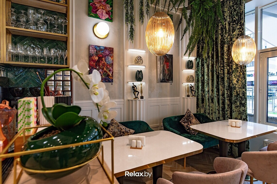 Интерьер Ольга описывает как изысканный, легкий, несколько гламурный. Без перегибов в сторону пафоса. Получилась в некоторой степени салонная атмосфера, местами напоминающая о тренде на ЗОЖ. Использовать старались преимущественно натуральные текстуры, позаботились и о тактильности: мраморные столы, бархатные шторы, выдержанные в схожей цветовой гамме, картины беларусских художников. Посадка в зале небольшая, порядка 27 мест, но скоро появится утопающая в цветах и зелени летняя терраса.