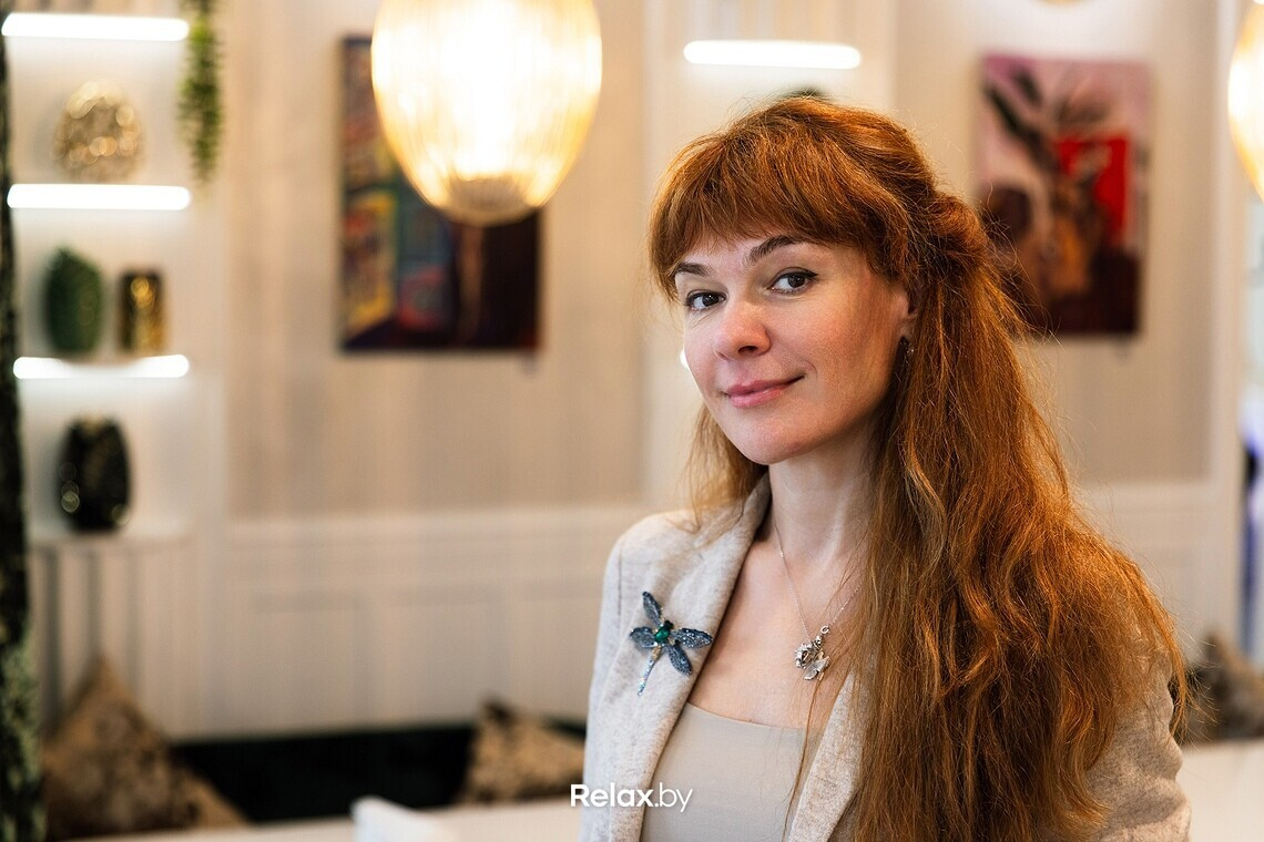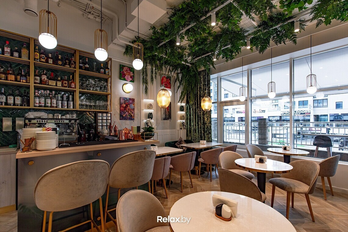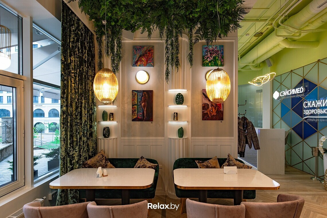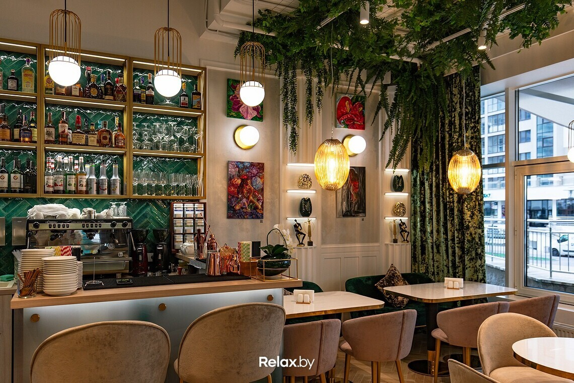 Интерьер Ольга описывает как изысканный, легкий, несколько гламурный. Без перегибов в сторону пафоса. Получилась в некоторой степени салонная атмосфера, местами напоминающая о тренде на ЗОЖ. Использовать старались преимущественно натуральные текстуры, позаботились и о тактильности: мраморные столы, бархатные шторы, выдержанные в схожей цветовой гамме, картины беларусских художников. Посадка в зале небольшая, порядка 27 мест, но скоро появится утопающая в цветах и зелени летняя терраса.