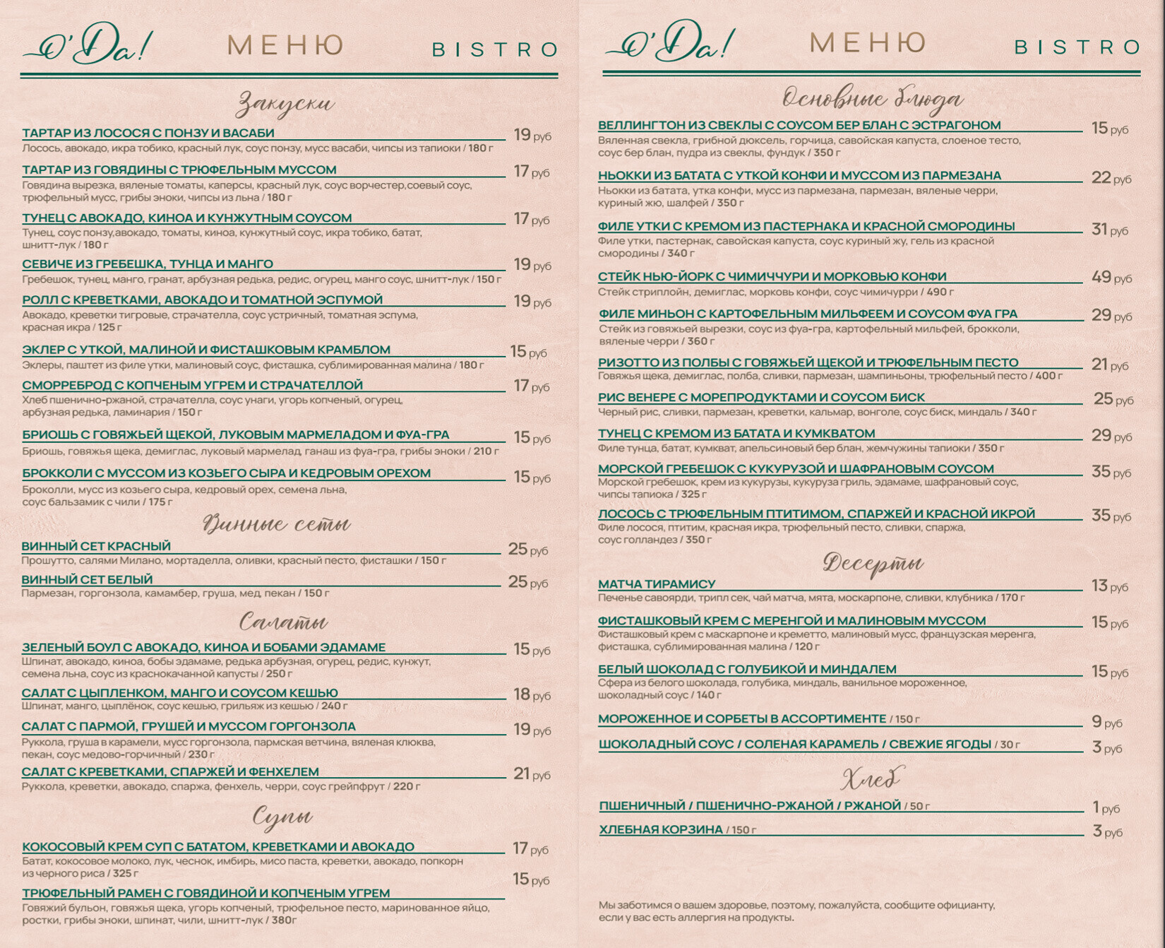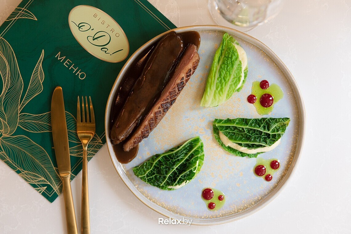 Кухня в «о’Да!» исключительно авторская, завязанная на персоне шеф-повара. Вячеслав Бобров описывает меню как некий фьюжн европейской классики и современной Азии.