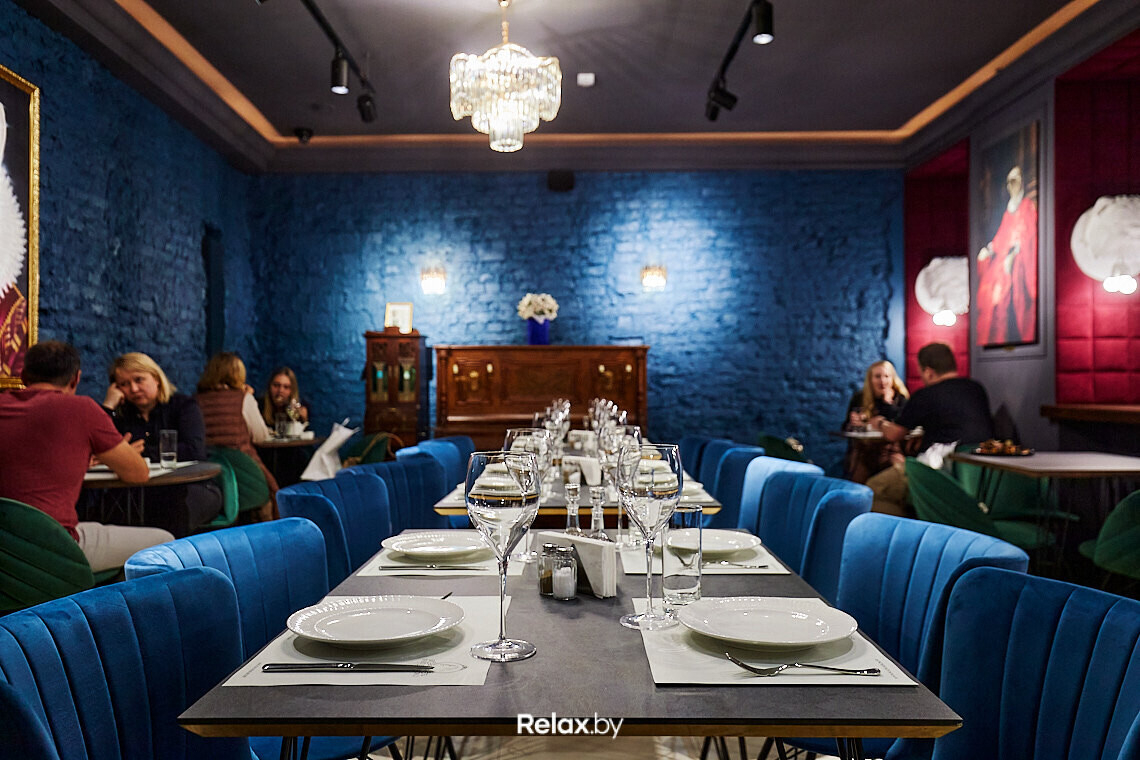 В интерьере — абсолютная эклектика, созданная с помощью дизайнера Юрия Алехно. Получилась этакая гостиная Коко: современная, но аристократичная. Классическая, но в то же время авангардная. Особый шарм пространству добавляют раритетные предметы: пианино 1893 года, уникальный беструбный граммофон, старинные весы и панно со штопорами в барной зоне.