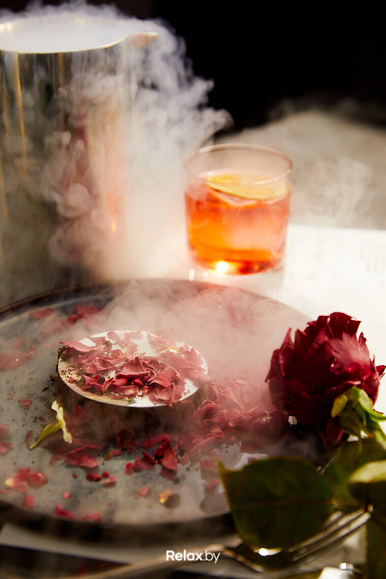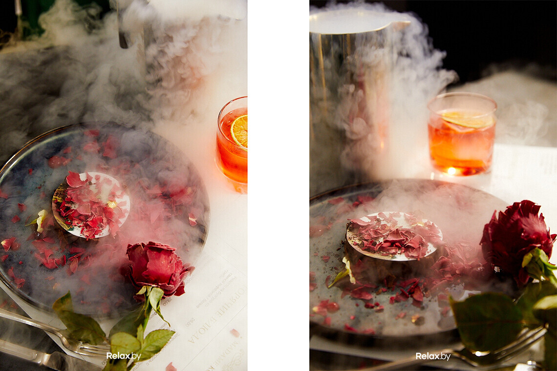 Одно из самых популярных блюд со дня открытия — шоколадное парфе со снегом из маринованной розы, шоколадным чипсом и ягодным соусом. Фишка не только во вкусе, но и в подаче с жидким азотом и съедобной розой, которая около недели маринуется в специальном составе из воды, сахарного сиропа, глюкозы, смеси цитрусовых, розмарина, чили и др. Вячеслав рассказывает, что за первые два-три дня работы было продано порядка 120 таких десертов.