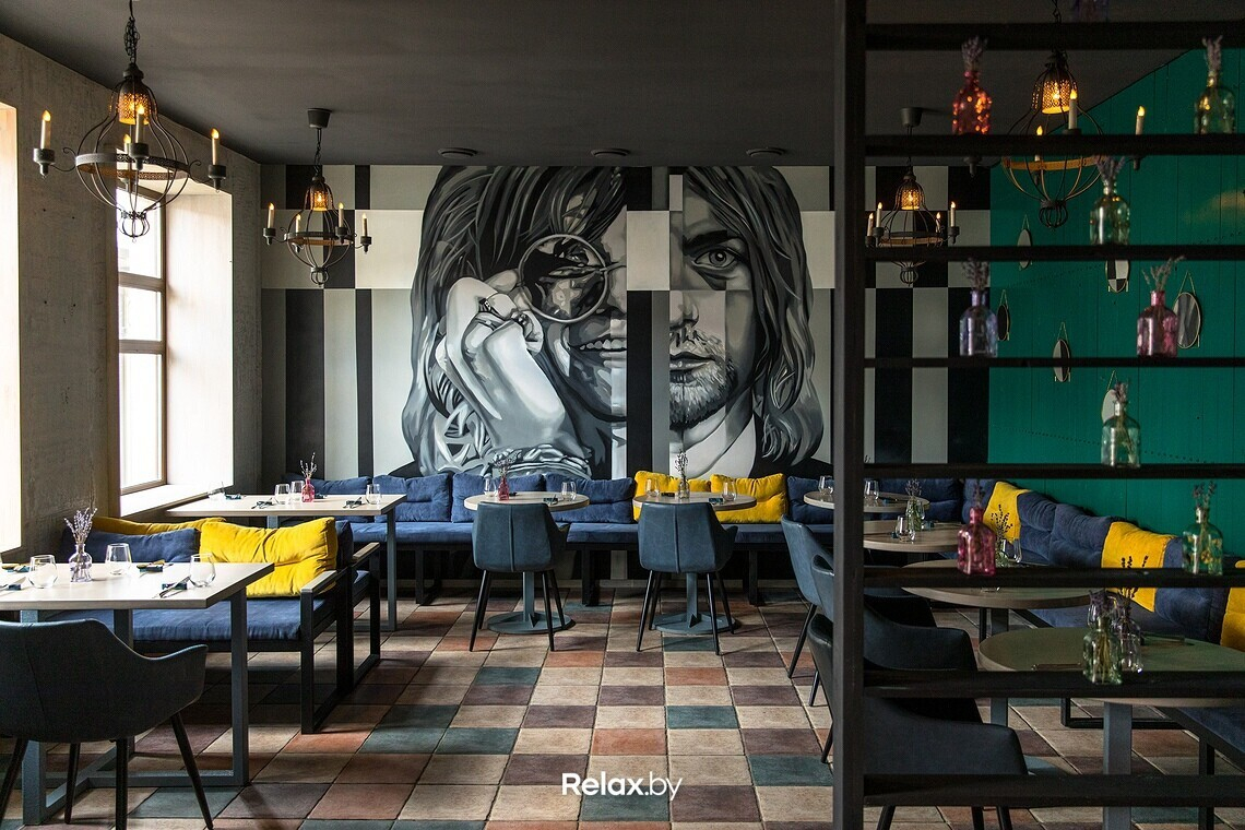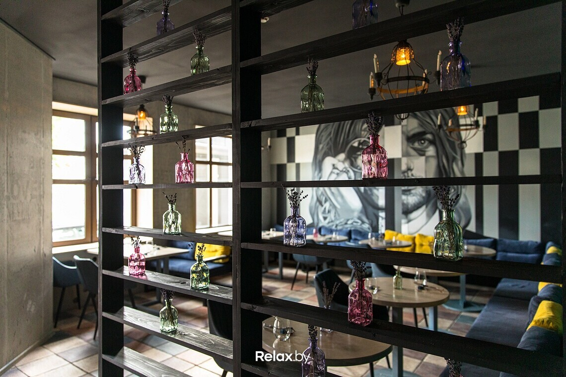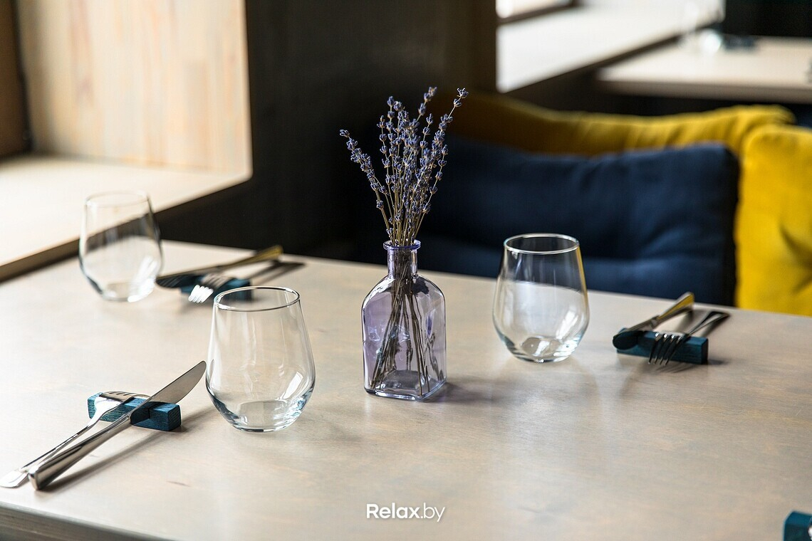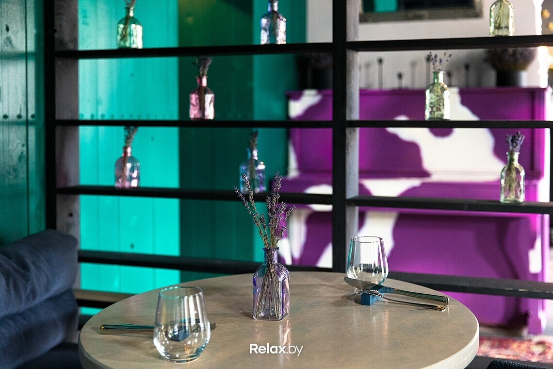 Дизайн получился в природных тонах: много оттенков зеленого и спокойного серого. За эмоции и красивые фото отвечают яркие вкрапления желтого и насыщенного сиреневого. Так на входе вас встретит яркий раскрашенный рояль, а далее по залу — экспозиции из цветов на потолке, обилие сухоцветов и даже беларусская лаванда. Вечерами в заведении царит полумрак при свечах.