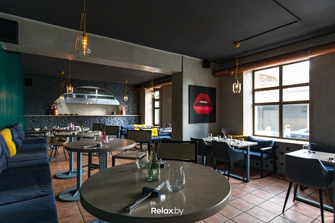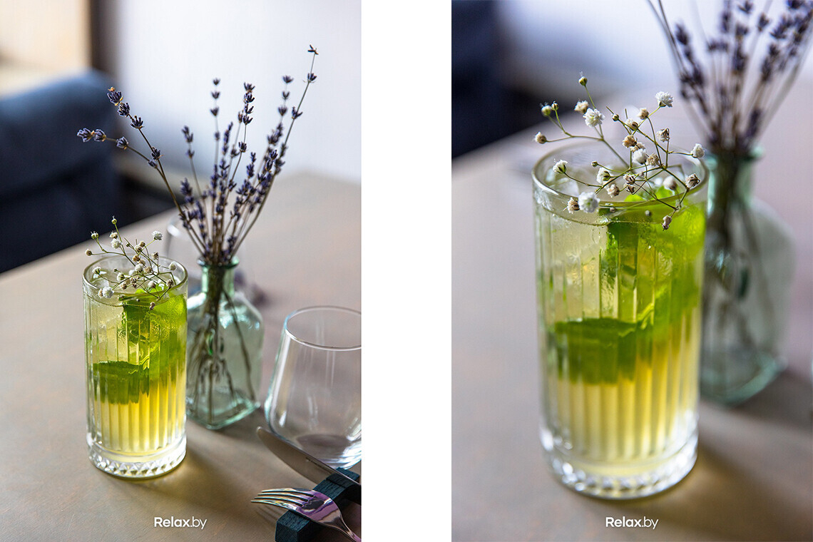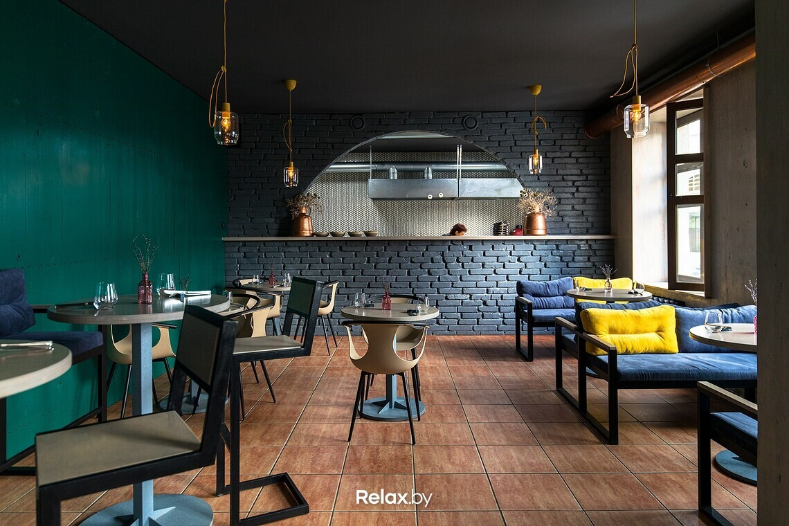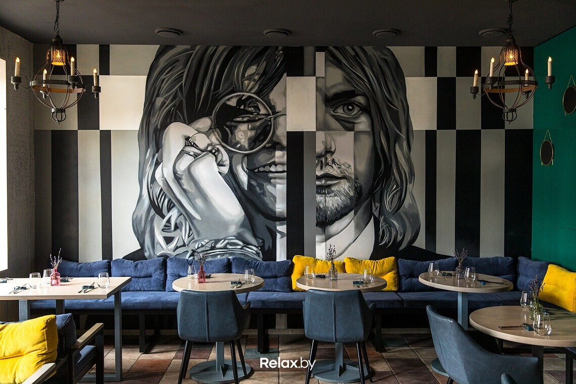 Дизайн получился в природных тонах: много оттенков зеленого и спокойного серого. За эмоции и красивые фото отвечают яркие вкрапления желтого и насыщенного сиреневого. Так на входе вас встретит яркий раскрашенный рояль, а далее по залу — экспозиции из цветов на потолке, обилие сухоцветов и даже беларусская лаванда. Вечерами в заведении царит полумрак при свечах.