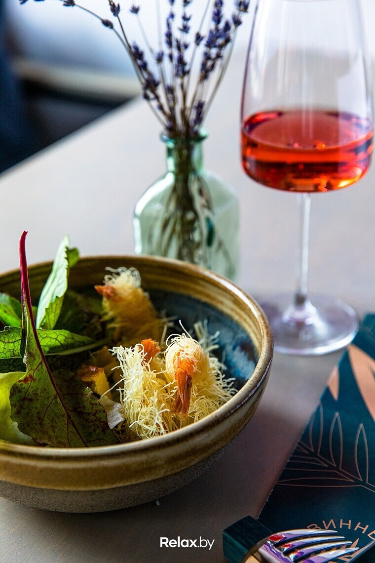 Важный момент в разделе «Тосты» — подача на злаковом хлебе собственного приготовления. Если вы поклонник модного нынче авокадо тоста, то выбирайте из трех вариантов: с трюфельным кремом, лососем и древесными грибами. К вину можно выбрать тапасы: сыры, оливки, вяленые томаты, салями и др. (от 4 руб за 50 г). Из салатов обратите внимание на вариант с креветкой катаифи (ниже на фото). Почти в каждом блюде встретите фермерские продукты по сезону.