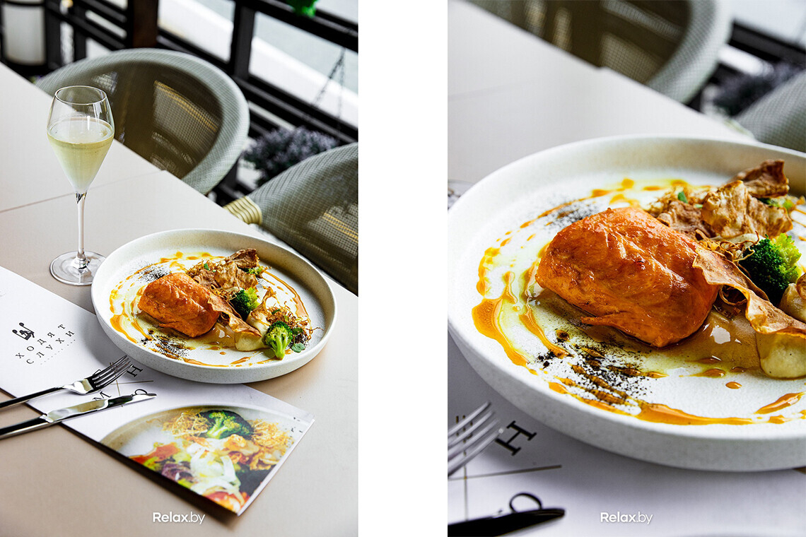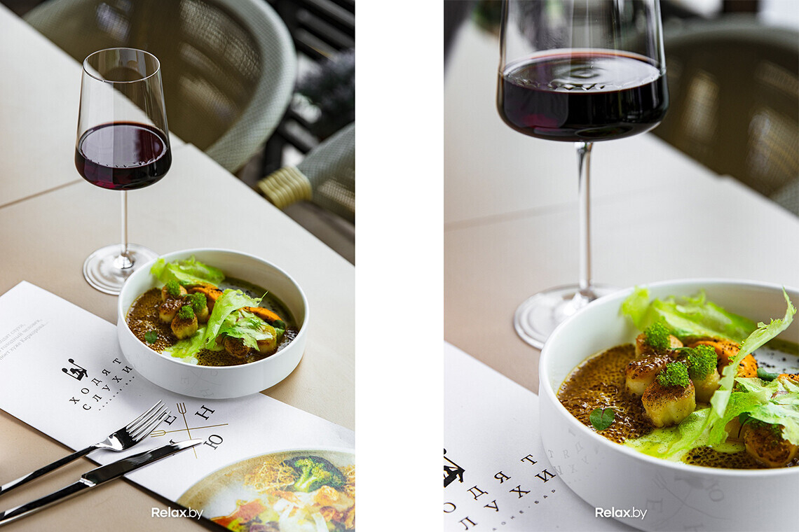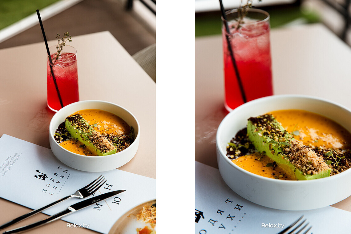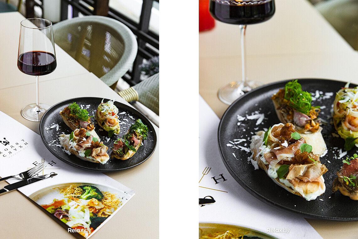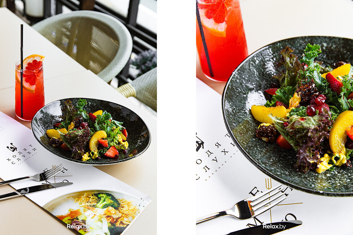 В меню авторские разработки шеф-повара чередуется с европейской классикой, итальянскими блюдами и трендовыми азиатскими позициями. Так здесь представлено порядка 8 брускетт с разными начинками: от креветок и пармской ветчины с сыром до тартара из шашлыка и овощной тапенады (от 11 до 14 руб). Также из закусок отметим патэ из утки с цитрусовым унаги (22 руб), татаки из лосося со свежим хреном (22 руб), сугудай из дорадо (21 руб). В категории салатов обратите внимание на вариант из печеной свеклы, батата, клубники и козьего сыра (16 руб), с карамелизированным персиком, рикоттой и моченой клюквой (24 руб) или на салат со спаржей, яйцом пашот и лососем (19 руб).