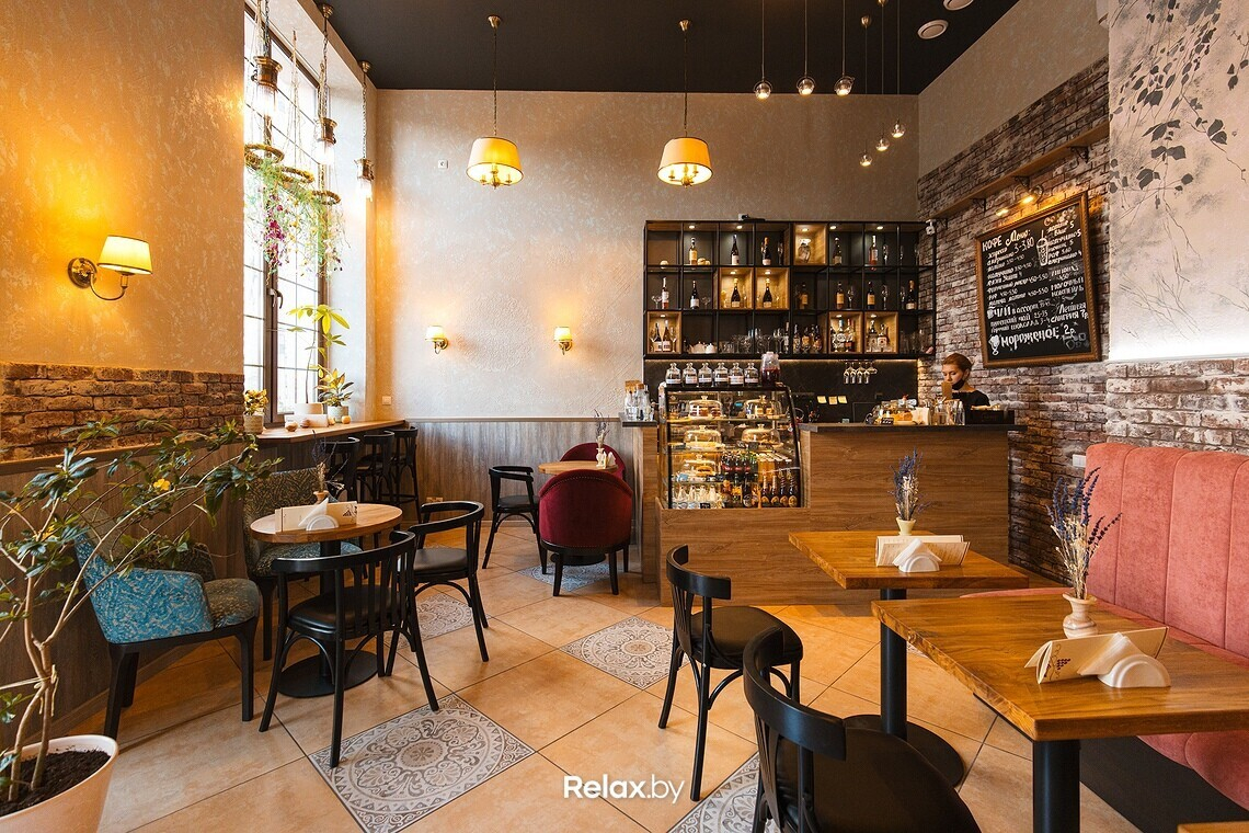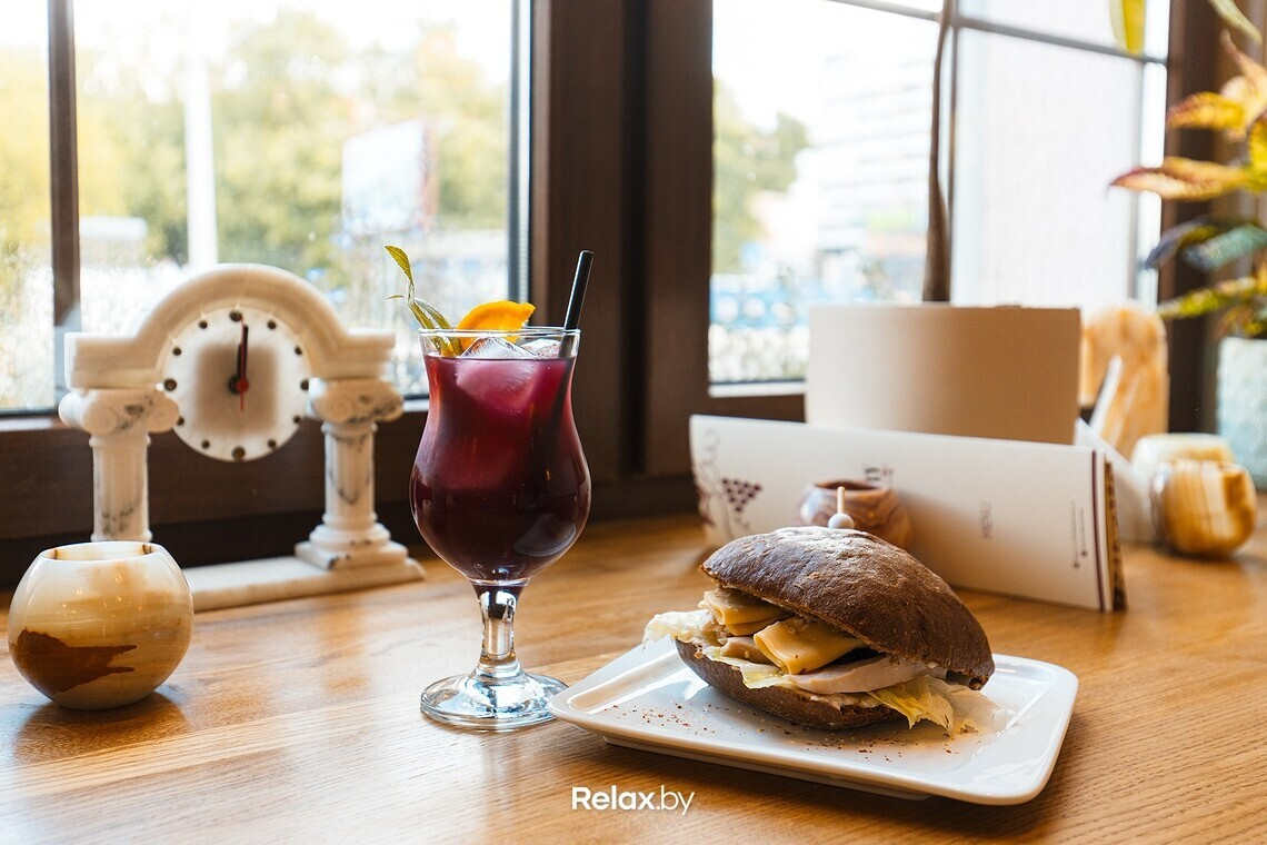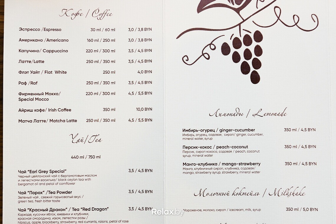 Есть и лаконичная коктейльная карта, в которой представлена в основном классика. Цены можно назвать демократичными: от 8 до 14 рублей. Винная карта поделена на страны, все позиции продают побокально (9 позиций от 7 до 8 руб.). Перекусить в кофейне тоже получится: помимо десертов, здесь подают салаты, брускетты, сэндвичи, сырную тарелку.