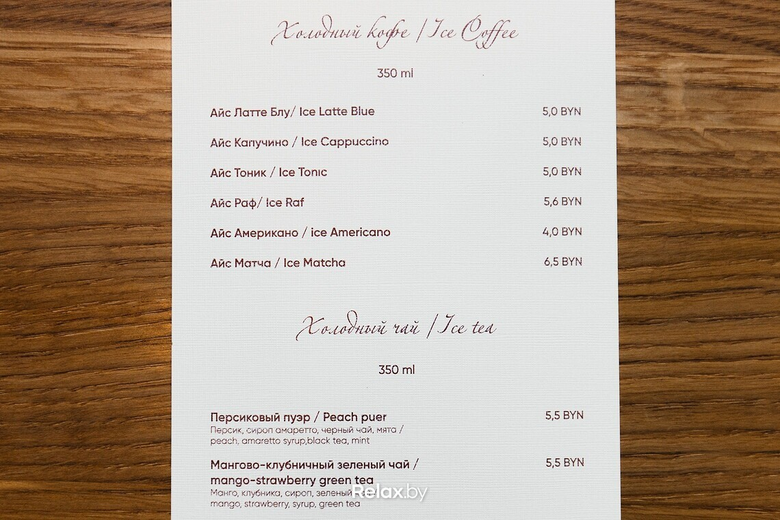 В карте напитков — кофейная классика, цены средние по городу. Американо — от 3 до 3,8 руб., латте — от 3,5 до 4,5 руб., капучино — от 3,5 до 4,5 руб., флэт уайт — за 4 руб, а фирменный мокко — от 4,5 до 5,5 руб.. В категории сезонных напитков 6 позиций: от холодного капучино до айс матча (от 4 до 6 руб.). Если доплатить 2 рубля, то любой напиток вам сделают на альтернативном молоке.