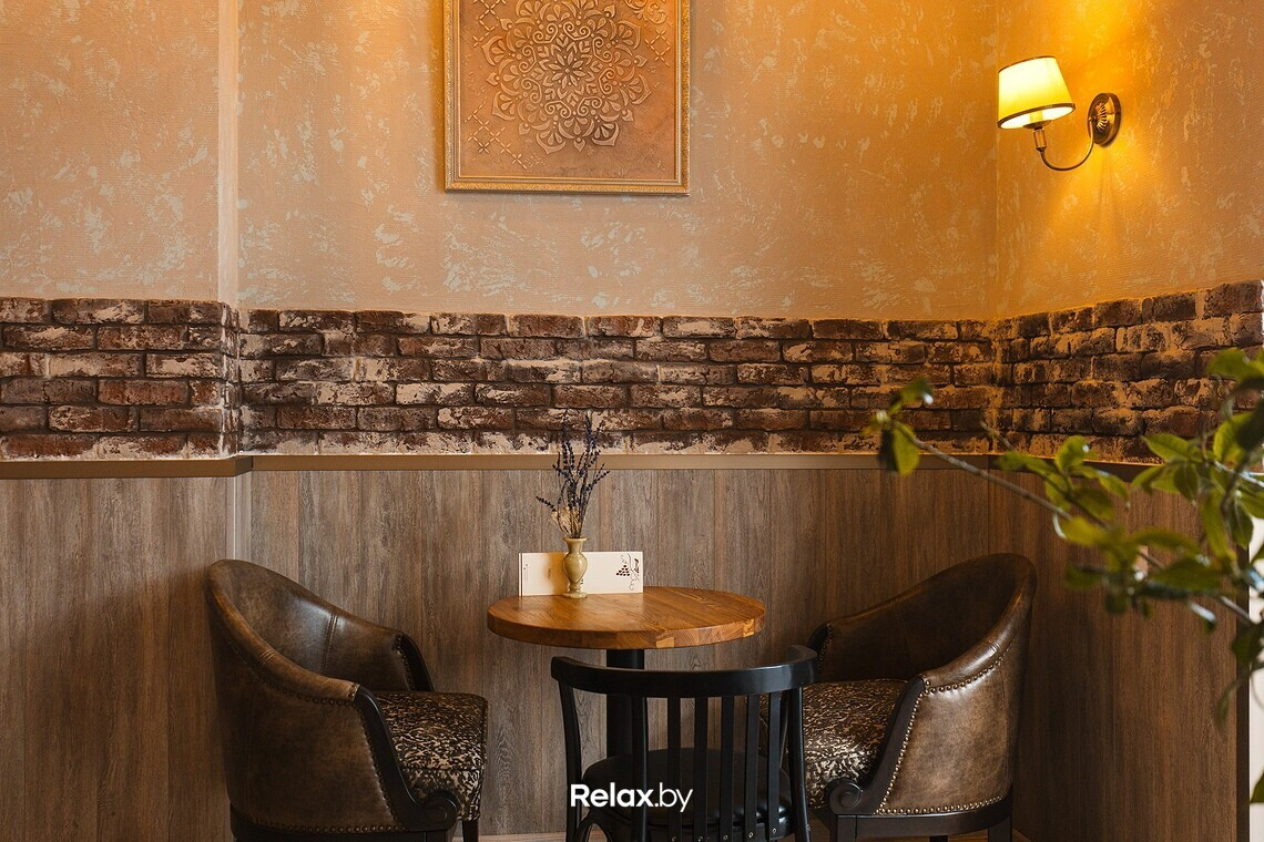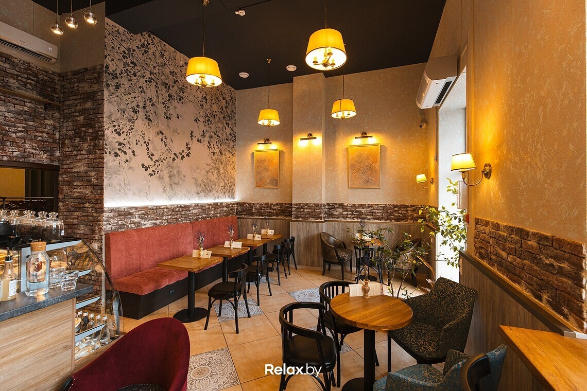 Первое впечатление от интерьера — уютно. В зале высокие потолки и панорамное окно, за счет чего в помещении много воздуха и света. Посадка в лучших традициях кофеен хаотичная, есть мягкая мебель и венские стулья. Лофтовые стены, кирпич, ламповое освещение, достаточно зелени. На окнах цепляют глаз любопытные композиции из цветов.