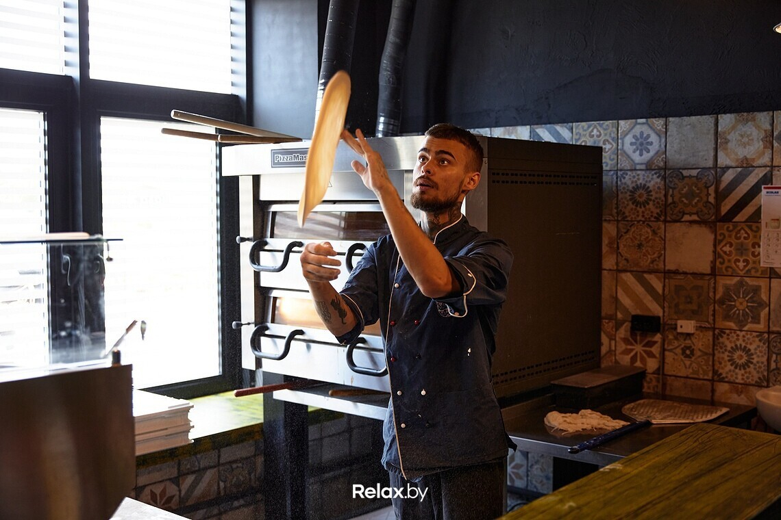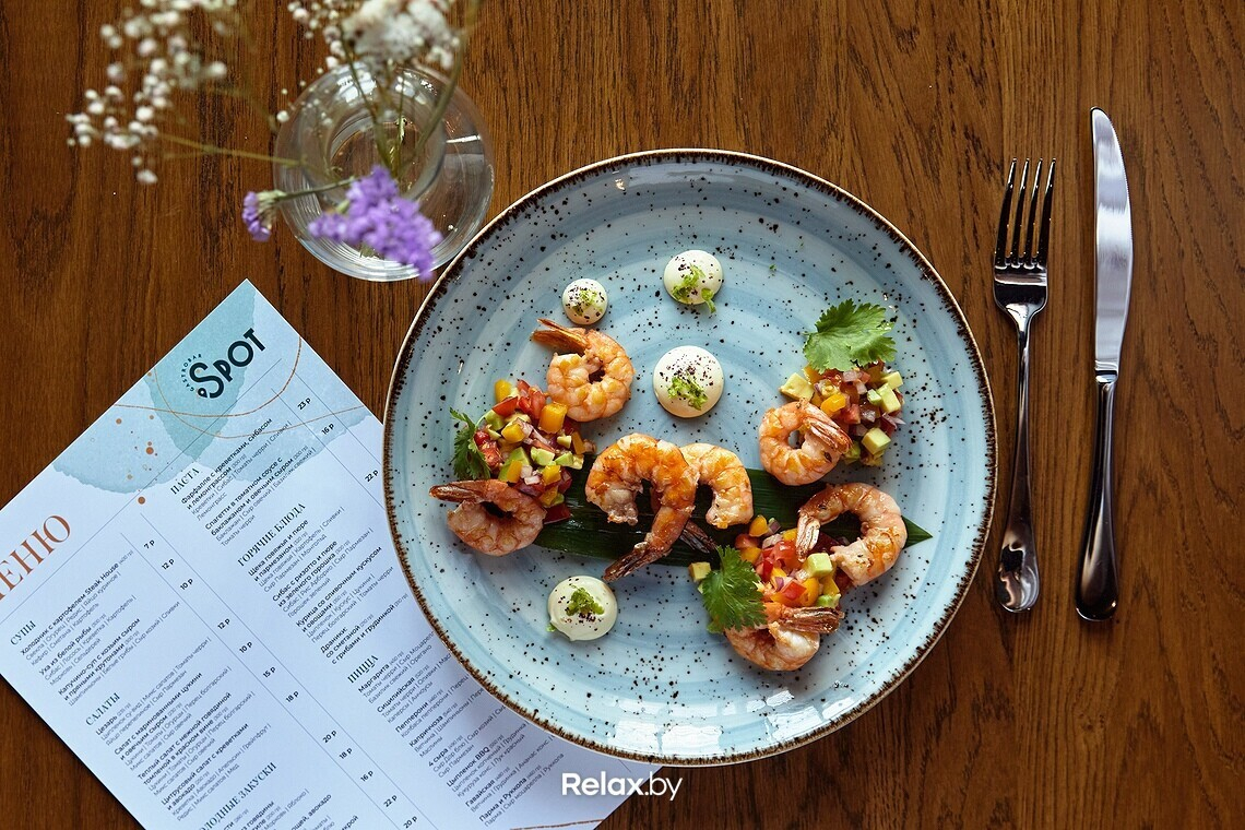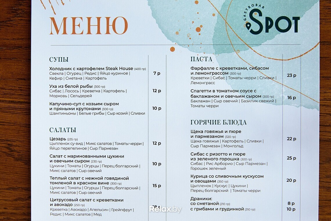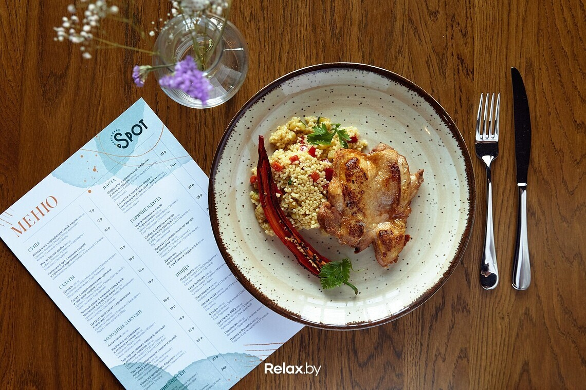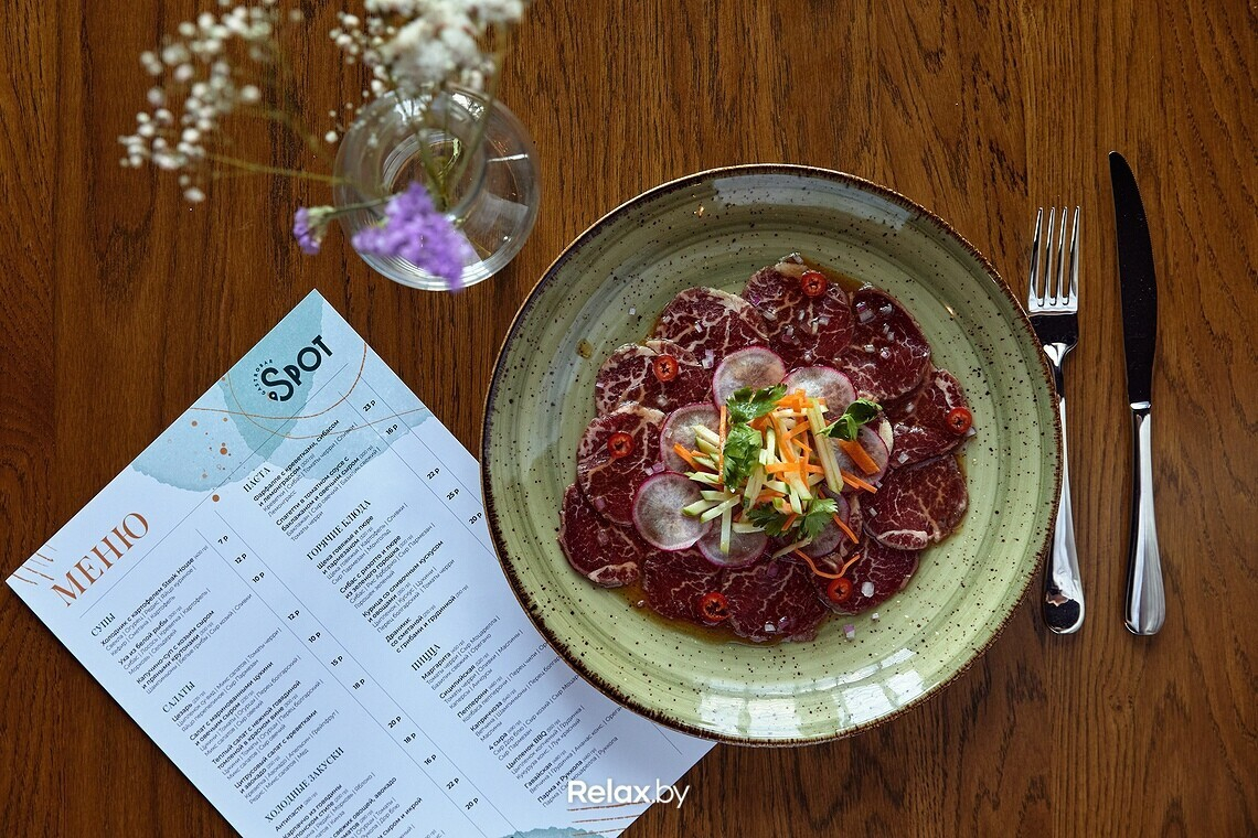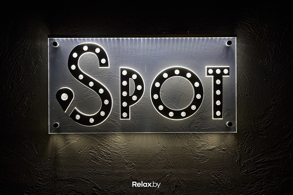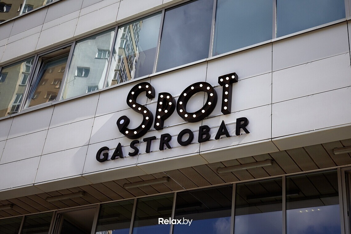 Меню Spot можно назвать космополитичным, но с упором на итальянскую кухню. Главный гастрономический посыл: теперь за кухней ресторанного уровня не нужно выезжать в центр города. Ключевое блюдо в меню — пицца, рецептуры которой разрабатывал шеф-повар Антон Каленик. По словам учредителя гастробара, Антон много обучался в этом направлении, и даже выигрывал профессиональные призы. Любопытно, что для пиццы используются преимущественно беларусские продукты. Шеф годами подгонял свои рецептуры под то, чтобы готовить именно из местных продуктов.