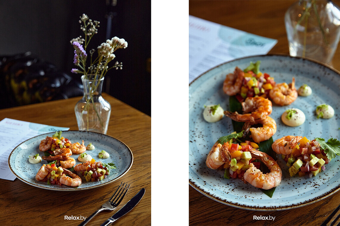 Из основного меню нам порекомендовали попробовать цитрусовый салат с креветками и авокадо (18 руб.), креветки с сальсой и лаймовым соусом (24 руб.), говяжьи щеки с пюре из пармезана (22 руб.), а также фирменный бургер, который появится в меню в ближайшее время. Заведение позиционирует себя как гастробар, поэтому в напитках упор сделан на вино и коктейли.