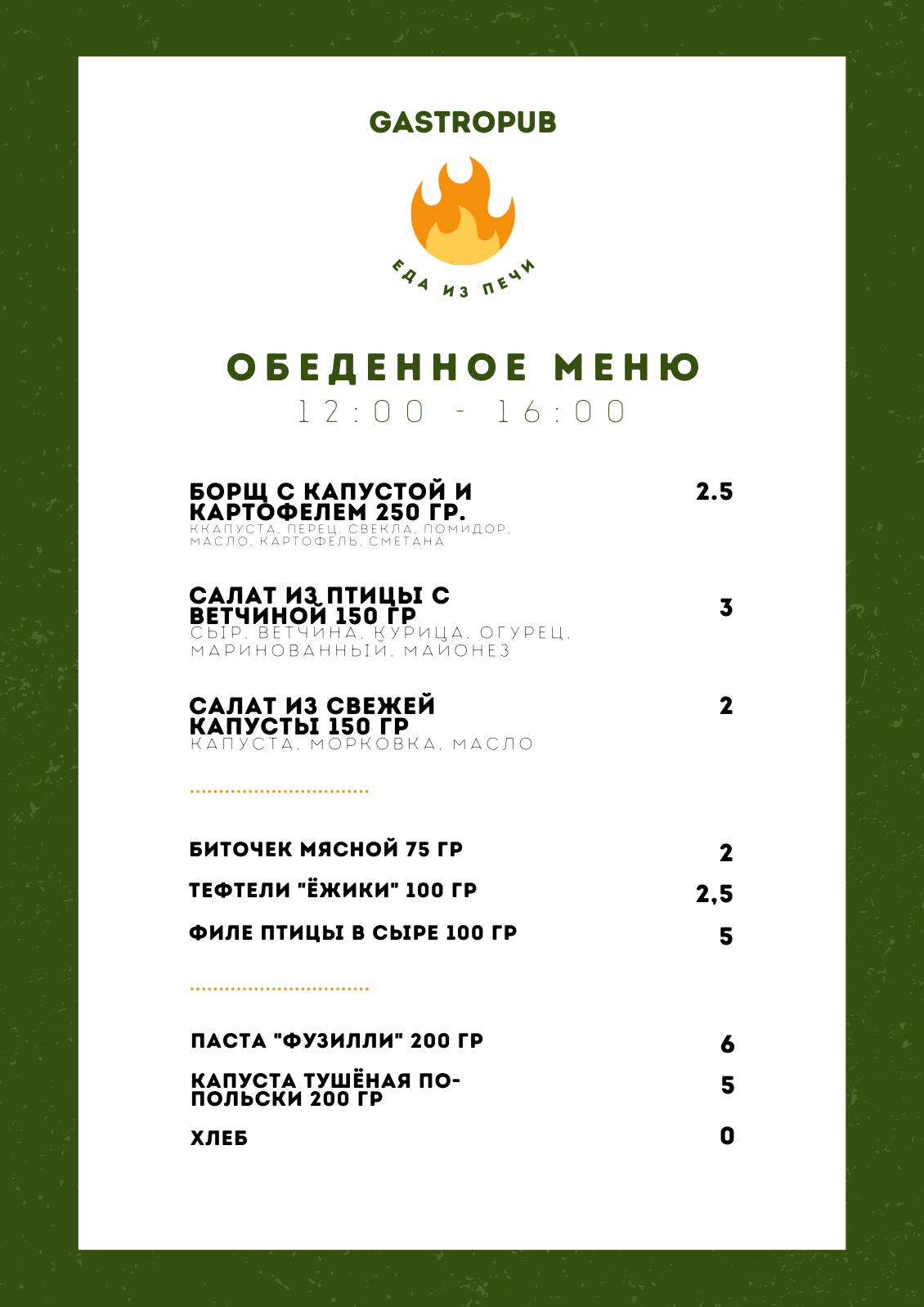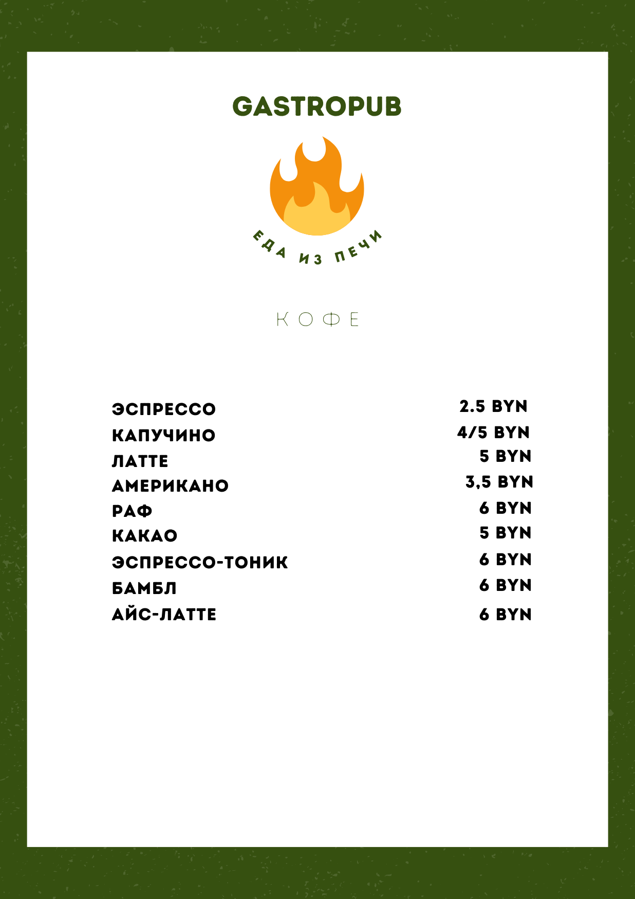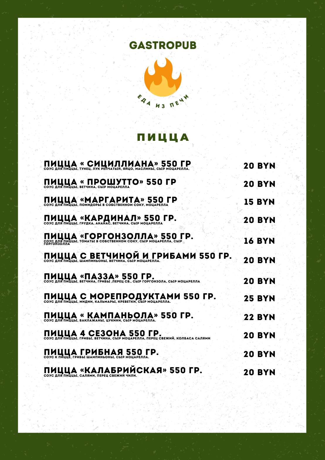 Кухня в кафе смешанная: итальянская, европейская и беларусская. Главная гордость меню, по словам Катерины, — пицца и домашние обеды. В скором времени появятся и сэндвичи.