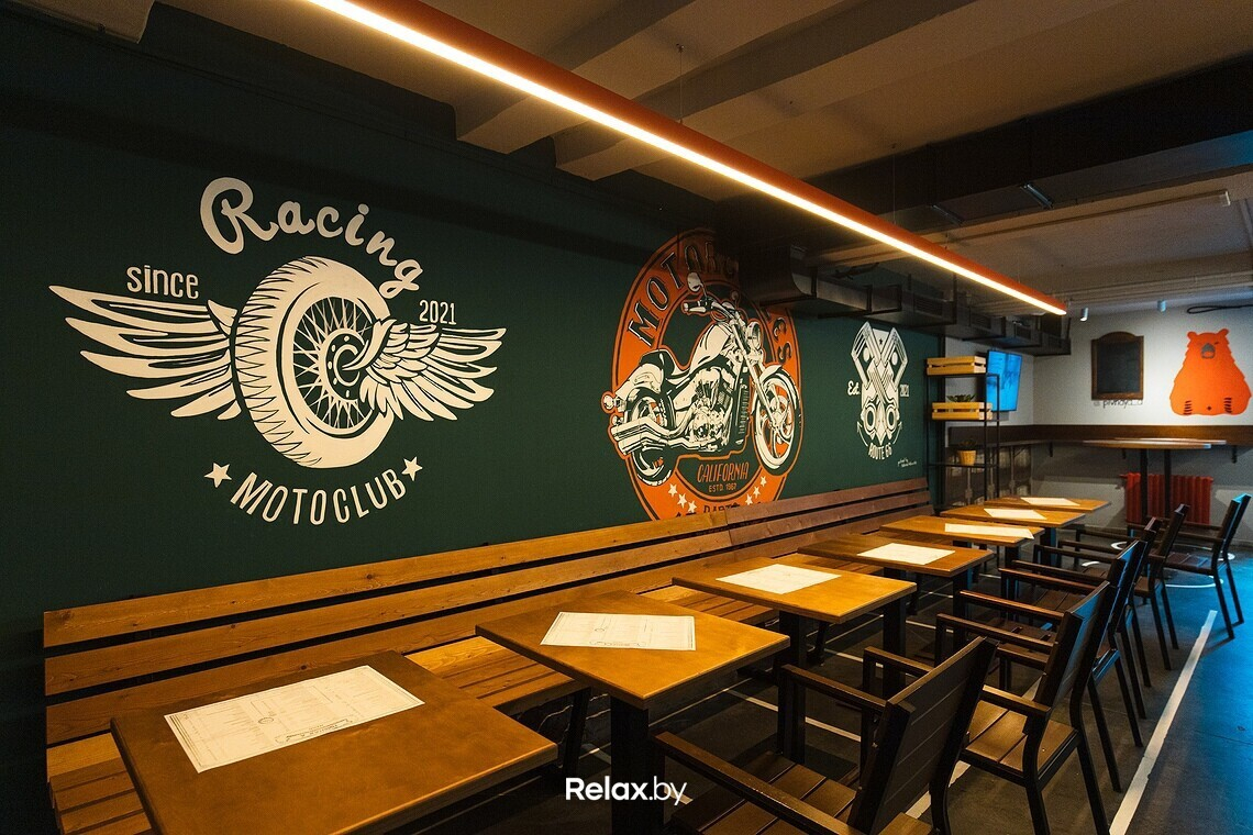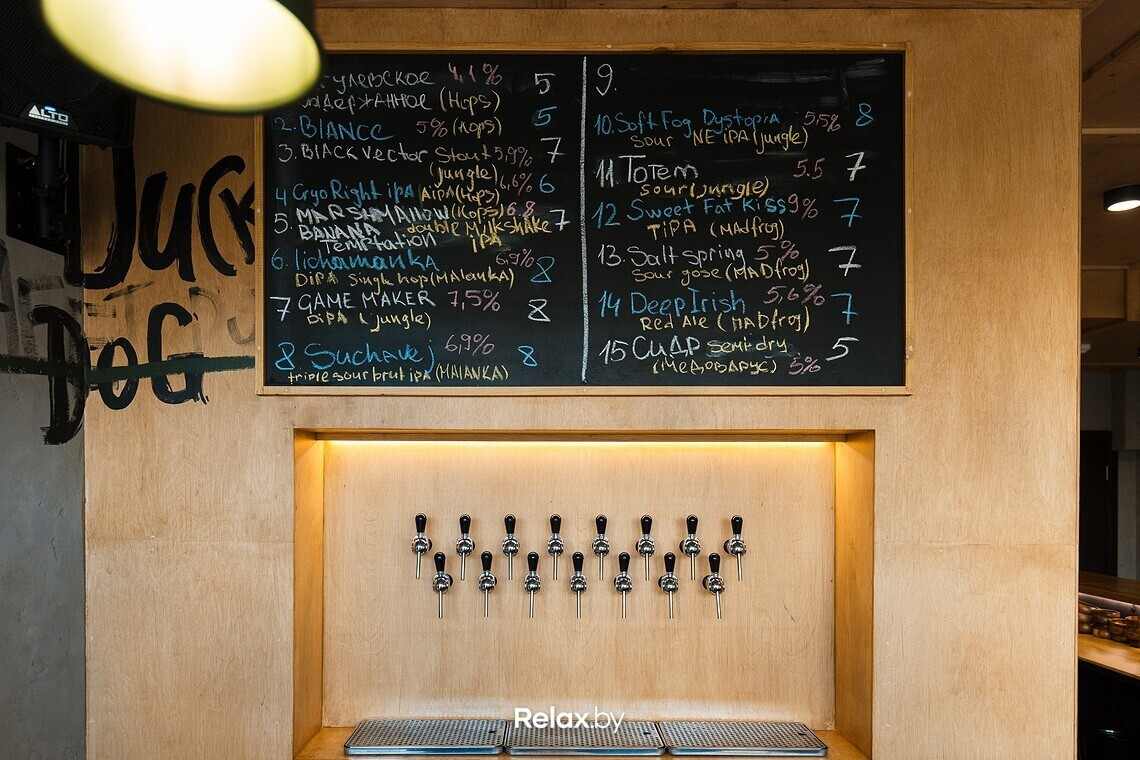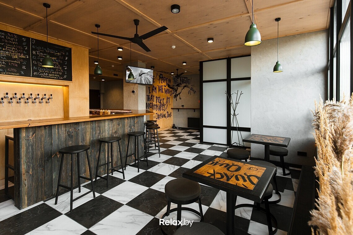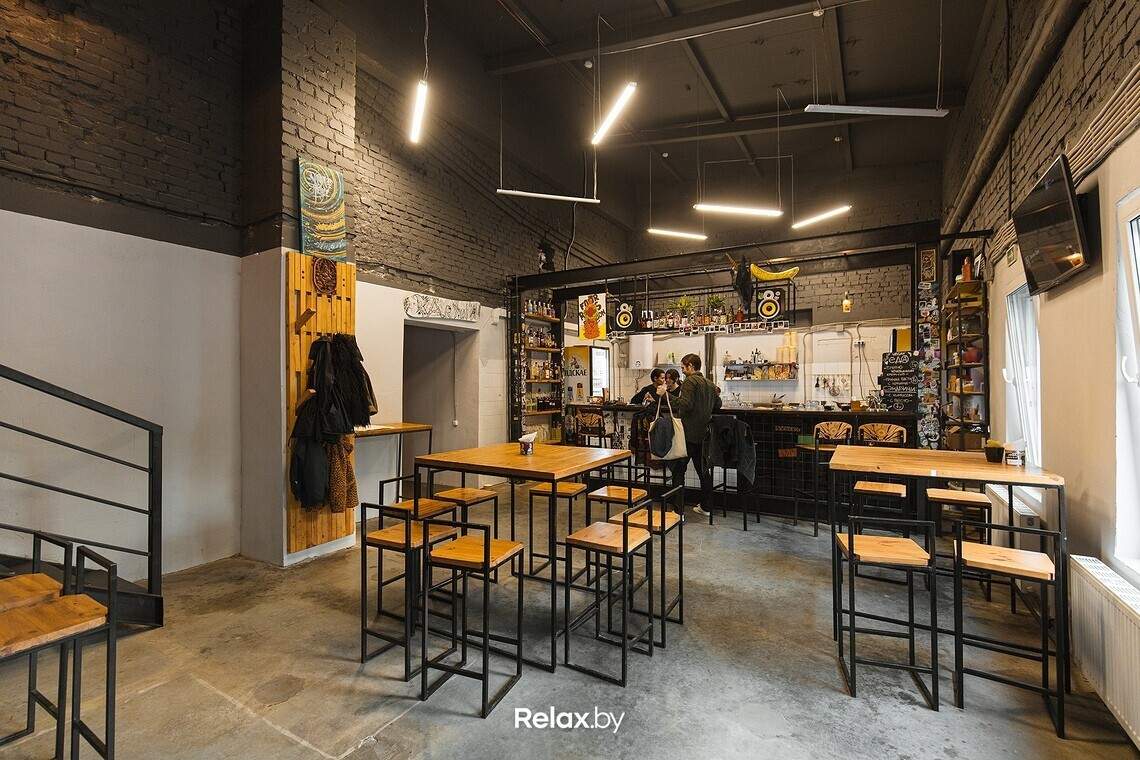Новое место в ЖК Minsk World позиционирует себя как «крафтовый бар на районе». В интерьере абсолютная демократия, в лучших традициях такого формата. Много дерева и металла, лофтовые стены, черно-белая мозаичная плитка, забавные надписи и незатейливый декор. Впрочем, больше ничего и не требуется, потому что основная зона притяжения здесь — барная стойка.