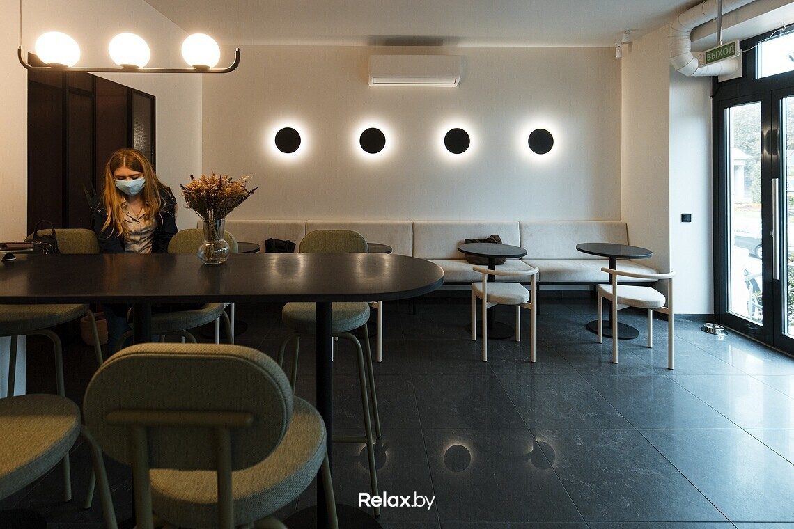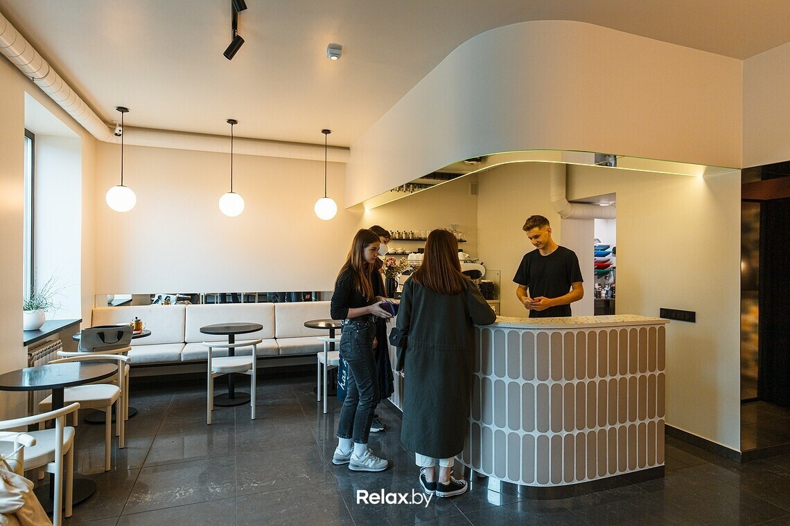 В интерьере свежей кофейни возле парка Горького актуальный нынче минимализм в бежевых тонах. Такие стены максимально фотогеничны. Плюс естественный свет из окон. Вкраплений ярких цветов в основном зале почти нет, оживляли пространство цветами, хорошим световым решением и приятной тактильностью поверхностей.