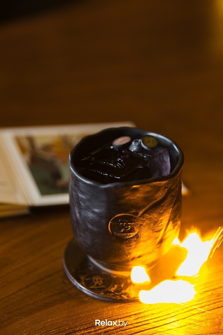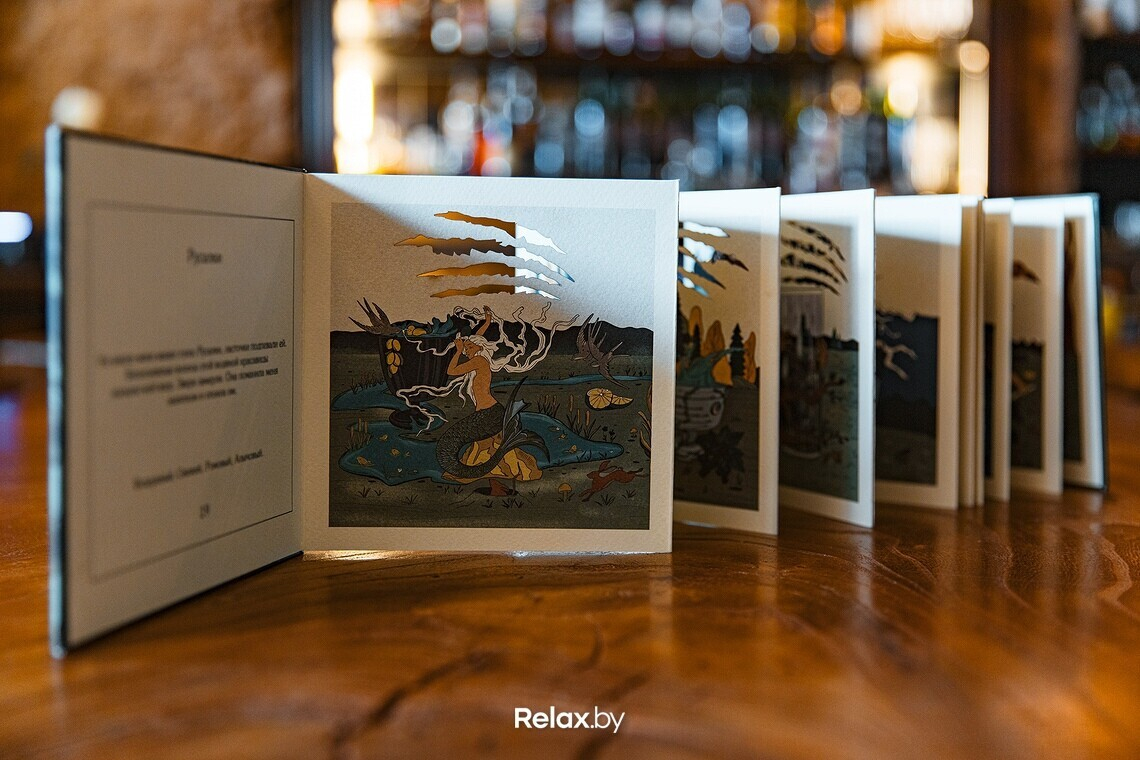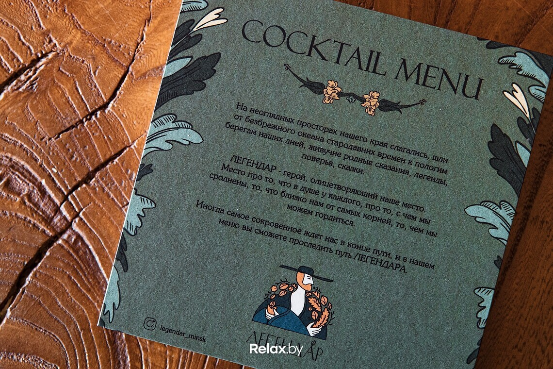 Авторское барное меню создавалось, как легенда. Коктейльная карта — это путь Легендара по спасению своей возлюбленной. По пути он встречается с различными сложностями, персонажами из мифов и легенд. Одна страница — одна история. Создавали карту шеф-бармены Иван Климович и Вячеслав Половец.