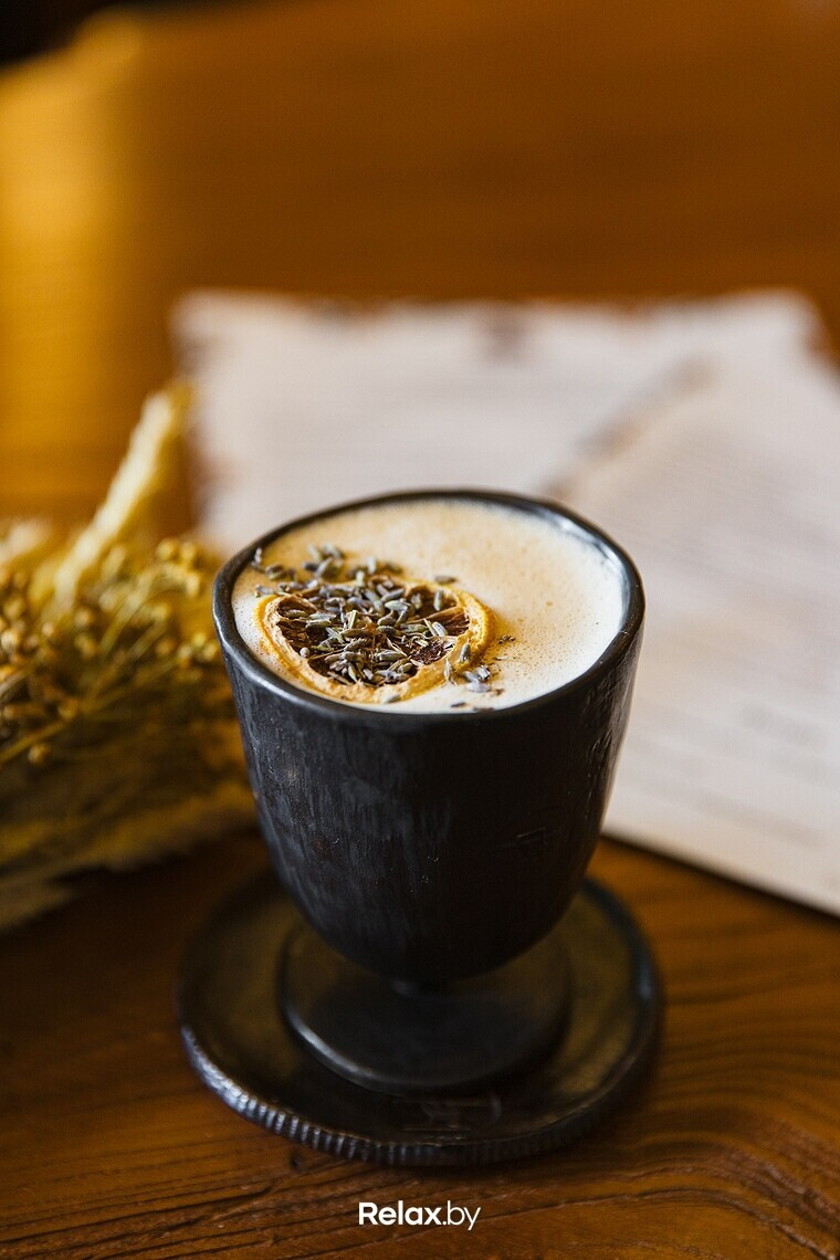 В кофейном меню рекомендуем обратить внимание на фирменные напитки, которые пересекаются с коктейльной историей. Например, для одного из них специально вываривают лавандовый сироп, для другого — смешивают домашний апельсиновый джем со сливками. Навынос кофе также можно взять: эстетика здесь даже в специально разработанном дизайне стаканчиков.