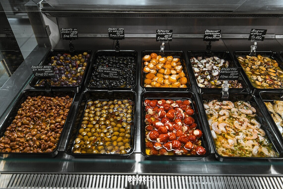 — Формат пивной заправки действительно был востребован, — рассказывает заместитель директора по развитию Алеся. — Но в меню было с большего мясо и фастфуд: наши фирменные колбаски, бургеры, ребрышки, популярные закуски из фритюра. Когда появилась идея деликатесного магазина, стало очевидно: продавать охлажденный лосось по соседству с шаурмой странно. Поэтому сменили формат и сделали уклон в средиземноморскую кухню.