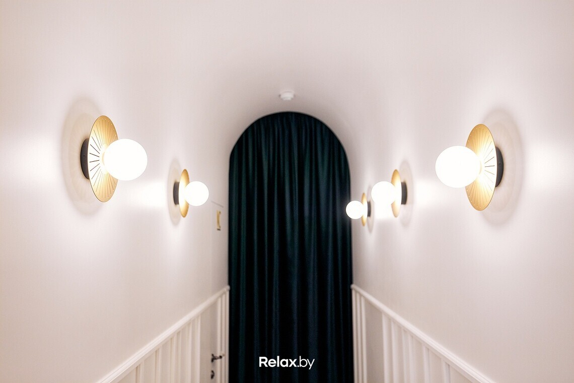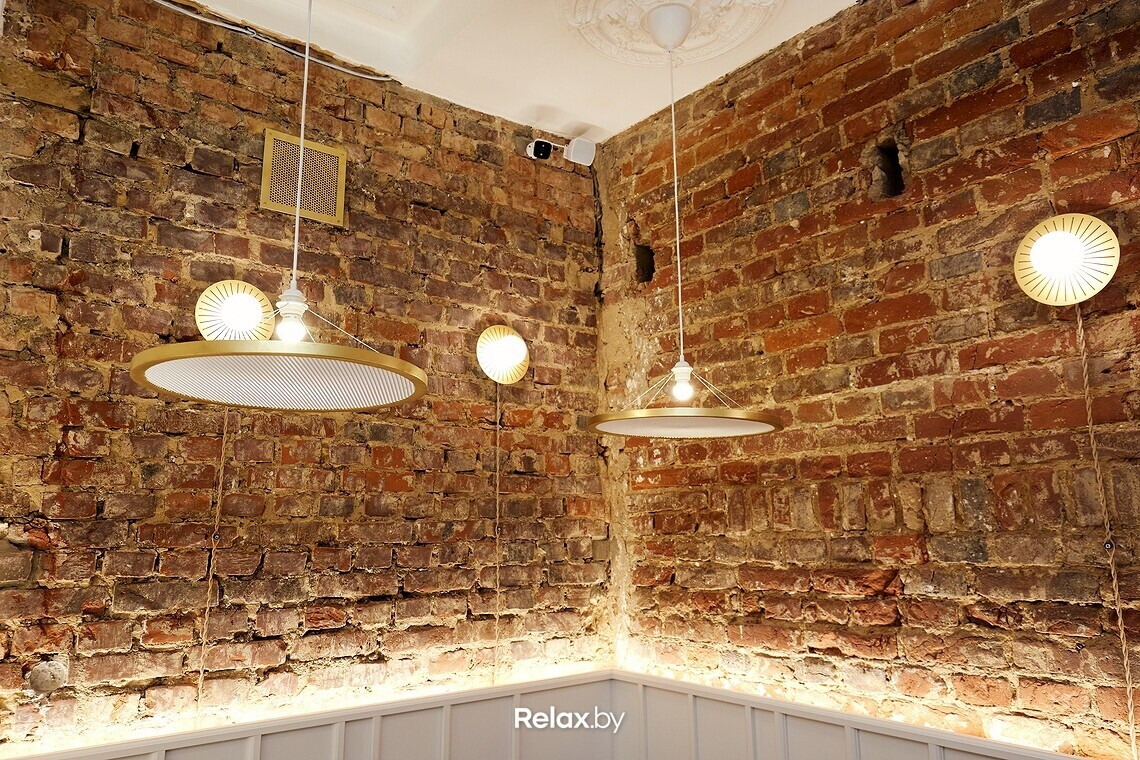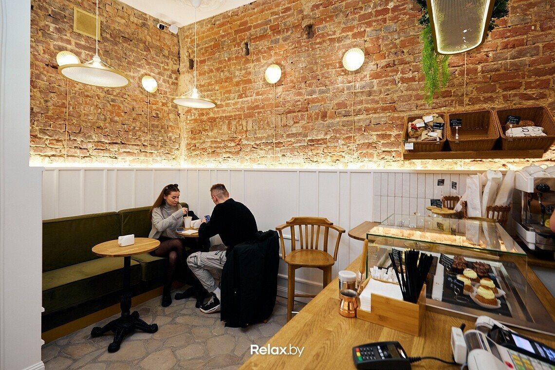 Помещение кофейни получилось небольшим — в зале всего 6 столиков. Дизайн-проект разрабатывала студия Dizzo Design. Ставку сделали на уже ставшее современной классикой сочетание белых стен и оголенной кирпичной кладки. В отделке много латунных вставок, на потолке можно заменить лепнину. Не обошлось и без модной нынче зелени.