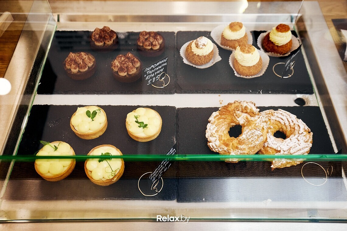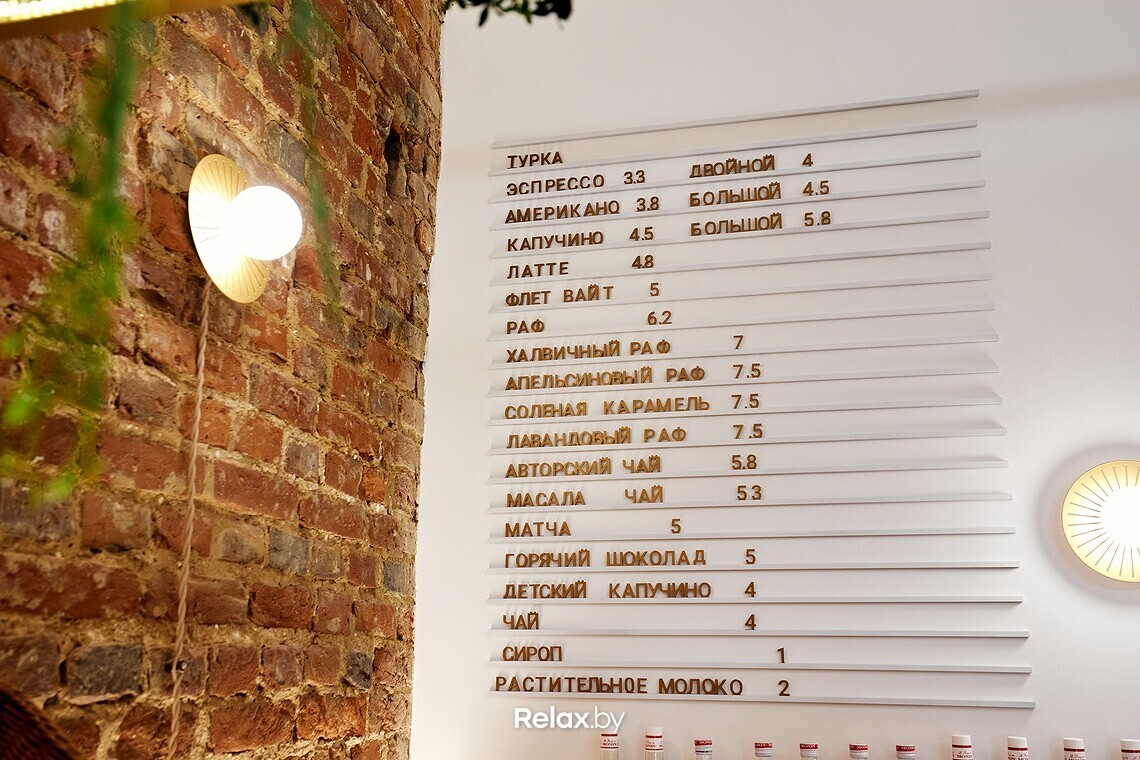 Цены в TURKA средние по Минску, но чуть выше, чем в Могилеве. Капучино можно заказать за 4,5 руб., латте за 4,8 руб., американо за 3,8 руб., а раф за 6,2 руб. Халвичный раф готовят за 7 руб., апельсиновый за 7, 5 руб., столько же стоит кофе с соленой карамелью. Любопытная позиция — детский капучино за 4 руб. Большой десертной витрины в зале нет, поэтому акцент будут делать на выпечку: печенье, круассаны, паштейши и др.