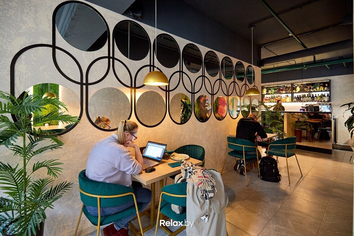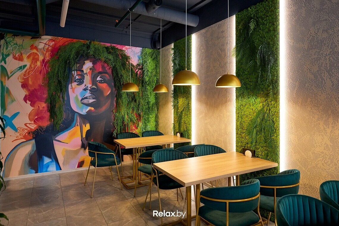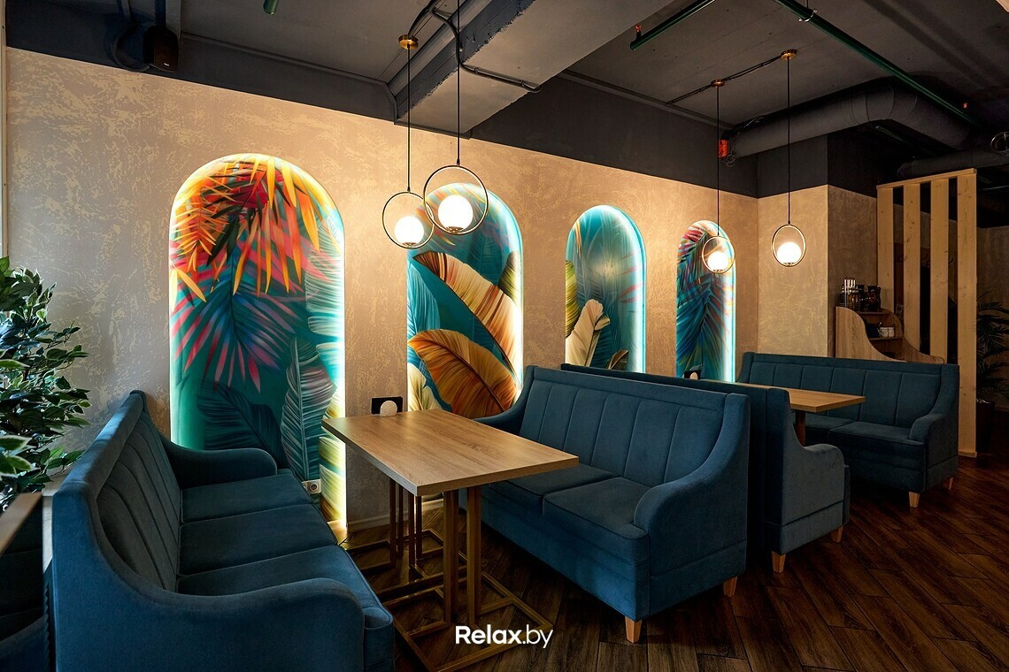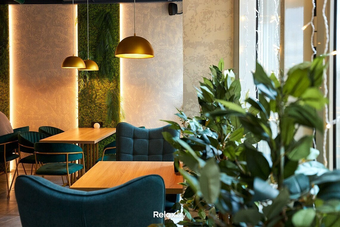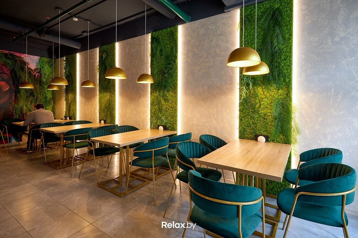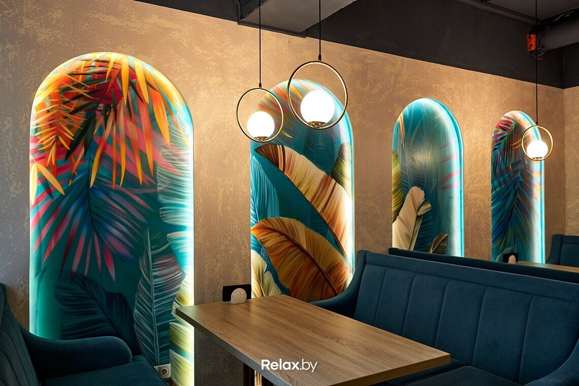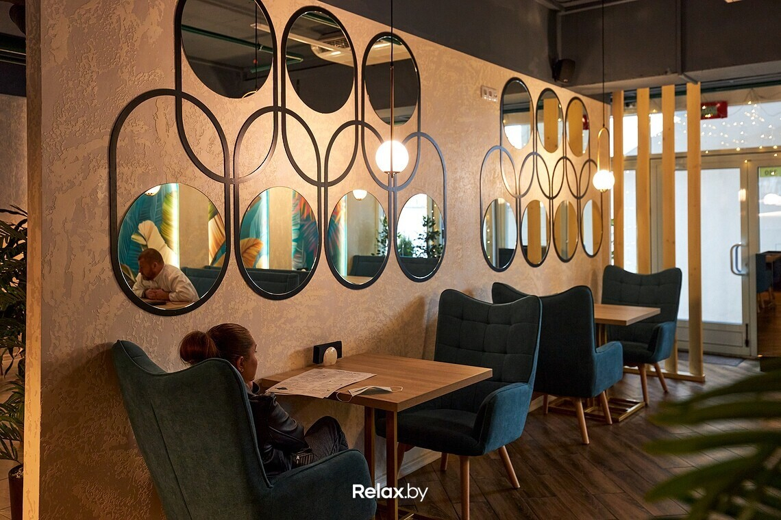 Пространство ресторана можно условно разделить на два зала. Дизайнеры использовали много зеркал, дерева, латунных деталей и зелени, имитирующей водоросли. Основная цветовая гамма — мягкие оттенки бирюзового (как отсылка к морской тематике). В одном из залов взгляд обязательно зацепится за световые панели с изображениями пальмовых веток. Днем в ресторане много естественного света, а вечером очень лампово: идеально для неспешного ужина с бокалом вина.