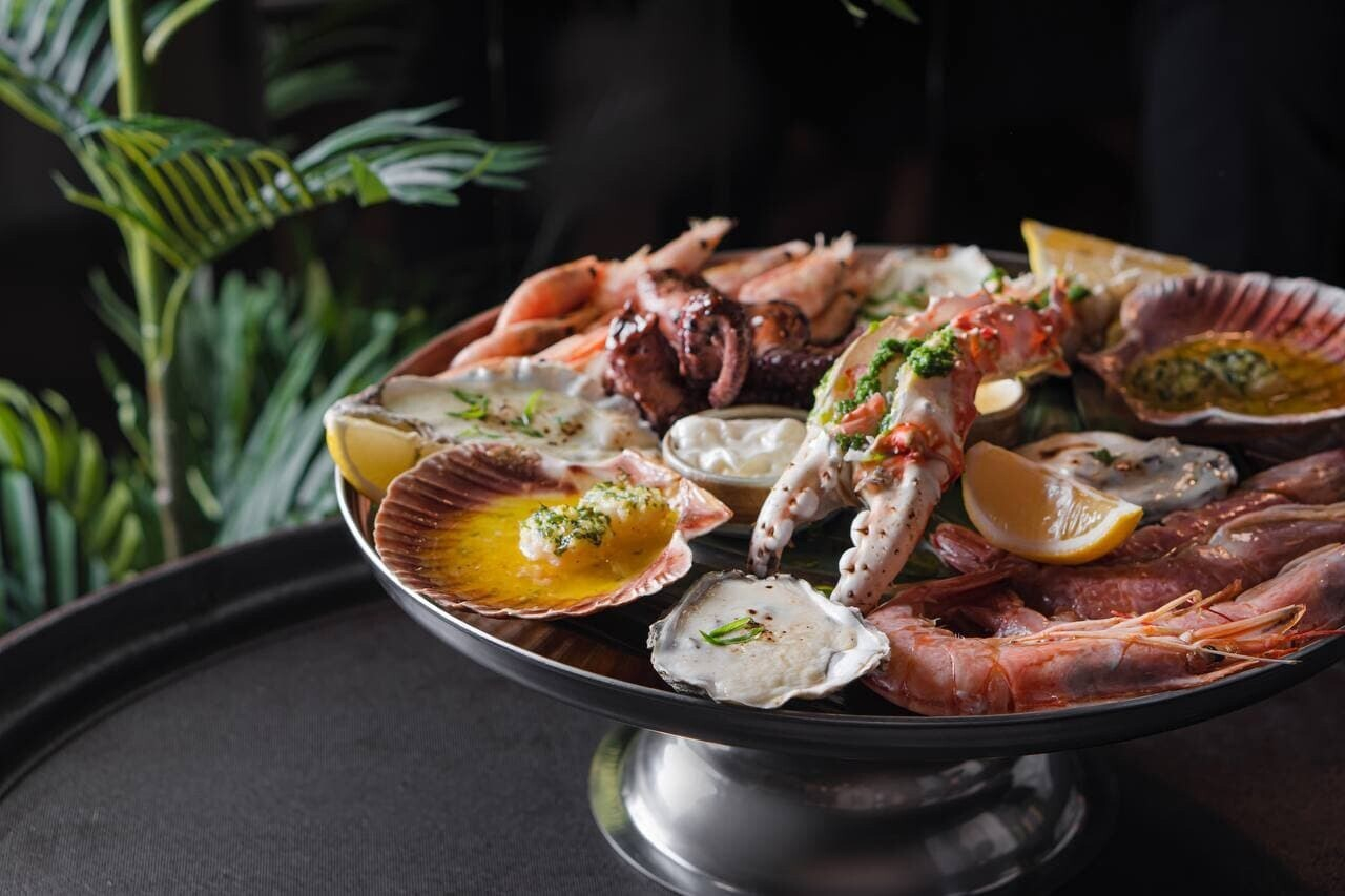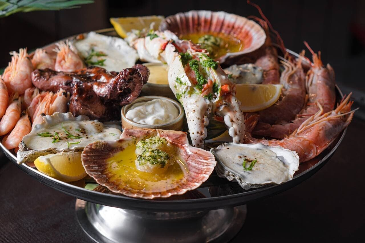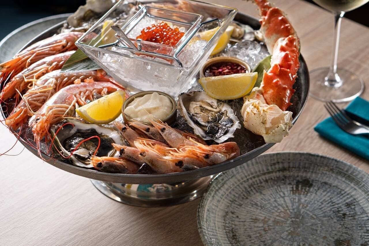 В основном меню, как мы заметили выше, упор сделан на морепродукты. Можно попробовать морские гребешки с пряным маслом, запеченные устрицы или лосося со шпинатом и сладким соусом чили. Отдельная рекомендация — плато морепродуктов: отварное и на гриле. Подача впечатляет: смотрите фото ниже.