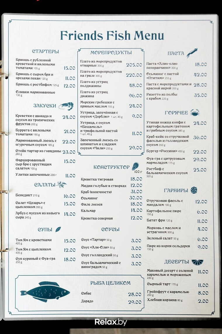 В ближайшее время во Friends Fish появятся ланчи. Шеф-повар рассказывает, что это будет своеобразное гастрономическое путешествие по странам мира. Одна неделя — одна страна (например, Италия, Испания, Франция). К концу месяца появятся и завтраки.