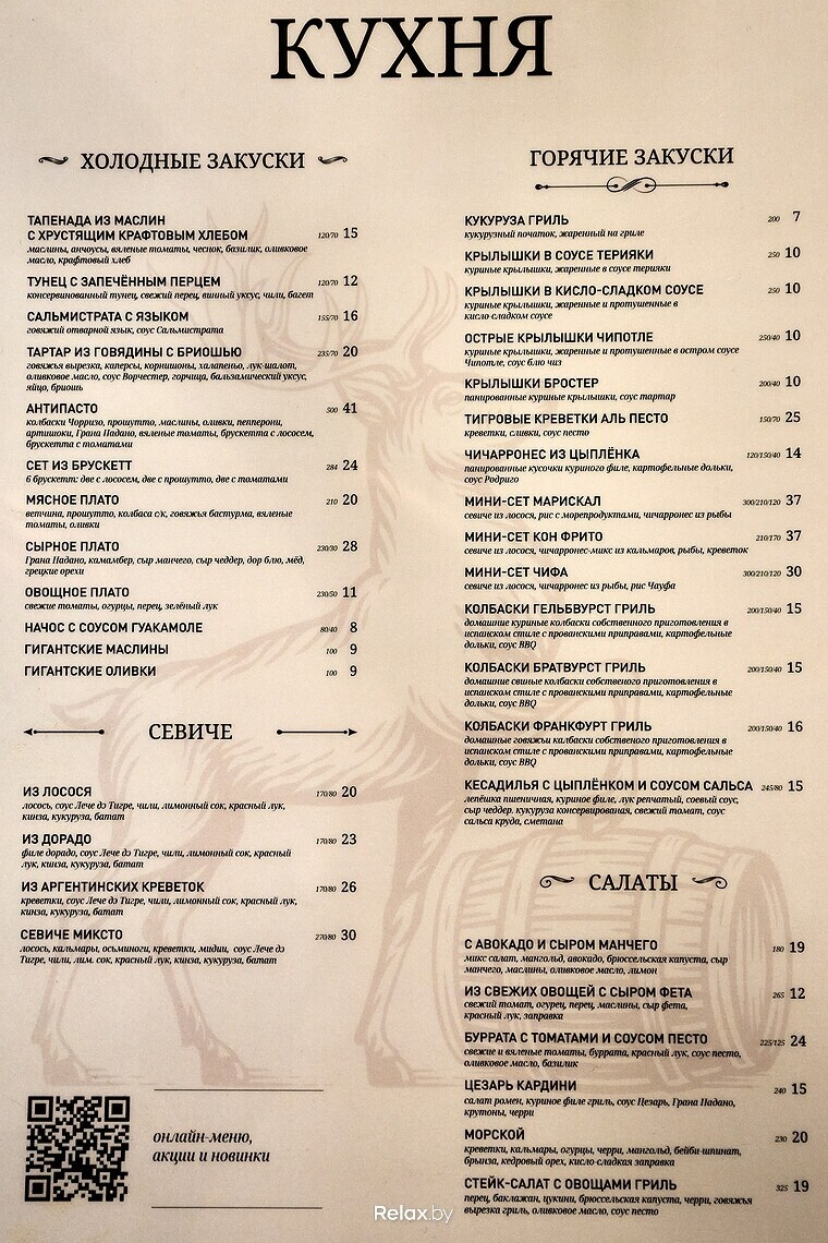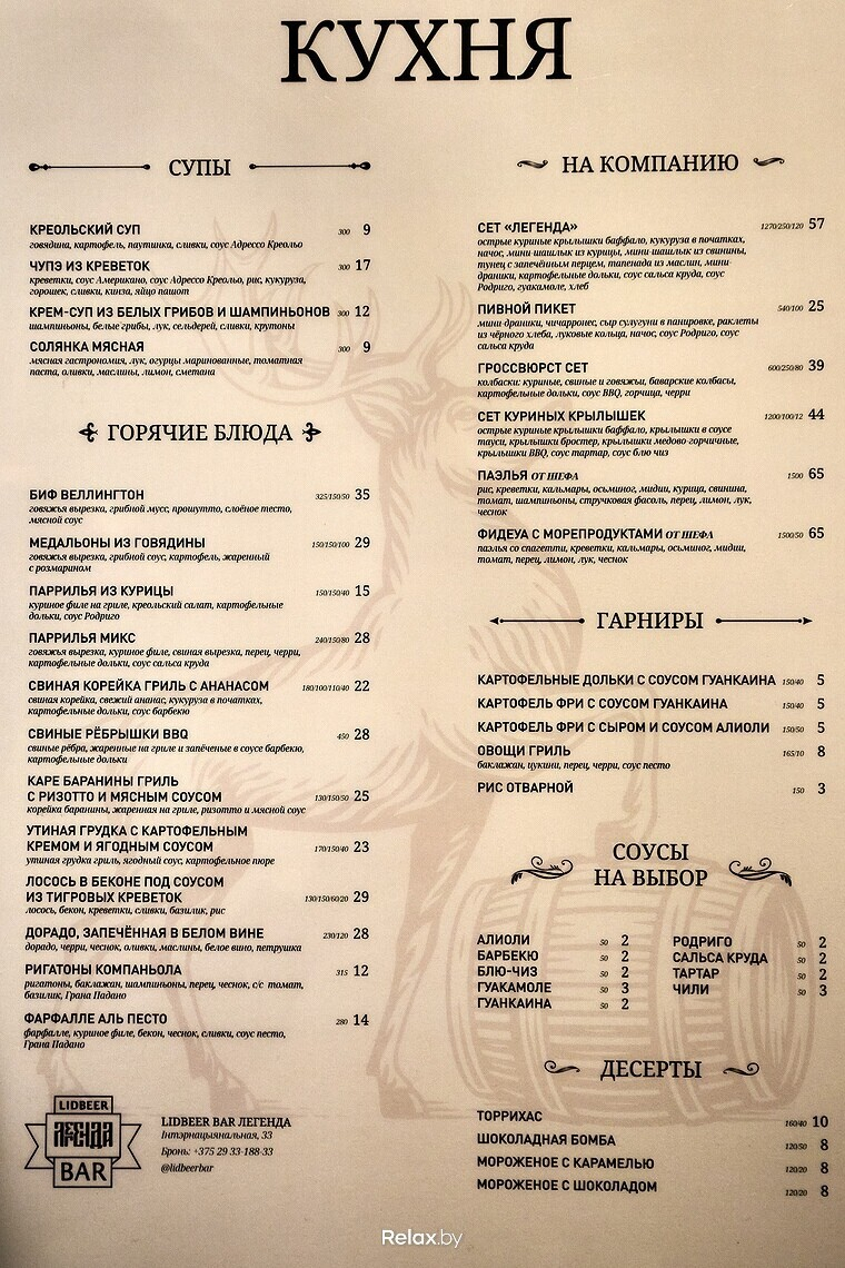 Меню получилось довольно объемным и с большего универсальным: каждый что-то найдет на свой вкус. Но не обошлось без испанского (да и в целом средиземноморского) акцента, как это впервые сделали при открытии Lidbeer bar «Светлый». За кухню свежего паба отвечал Виктор Родригез, работавший в Tapas Bar, поэтому 70% блюд в меню можно было отнести к испанской кухне. В меню «Легенды» также есть начос, кесадилья, фидеуа и фирменная позиция — паэлья с морепродуктами.
