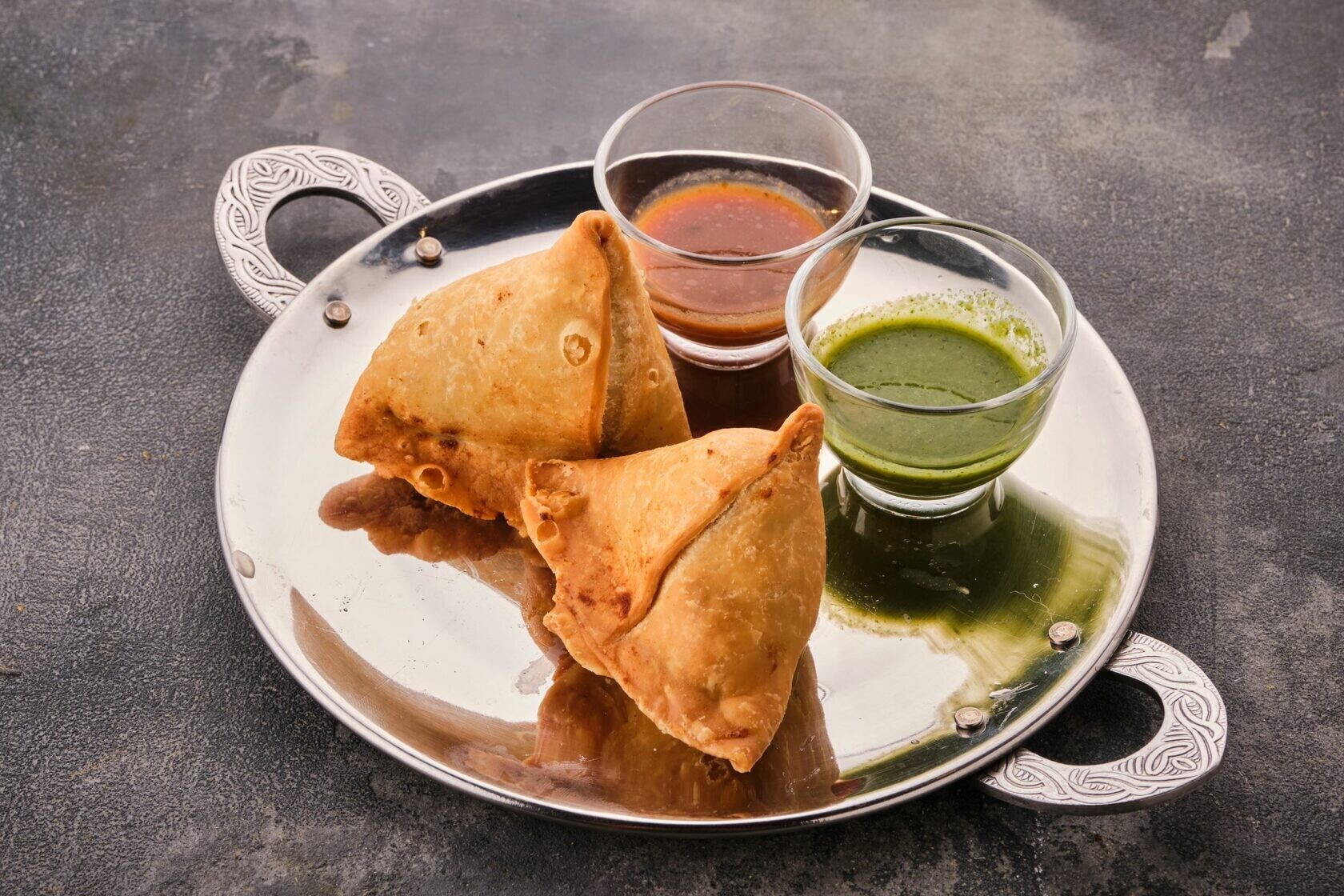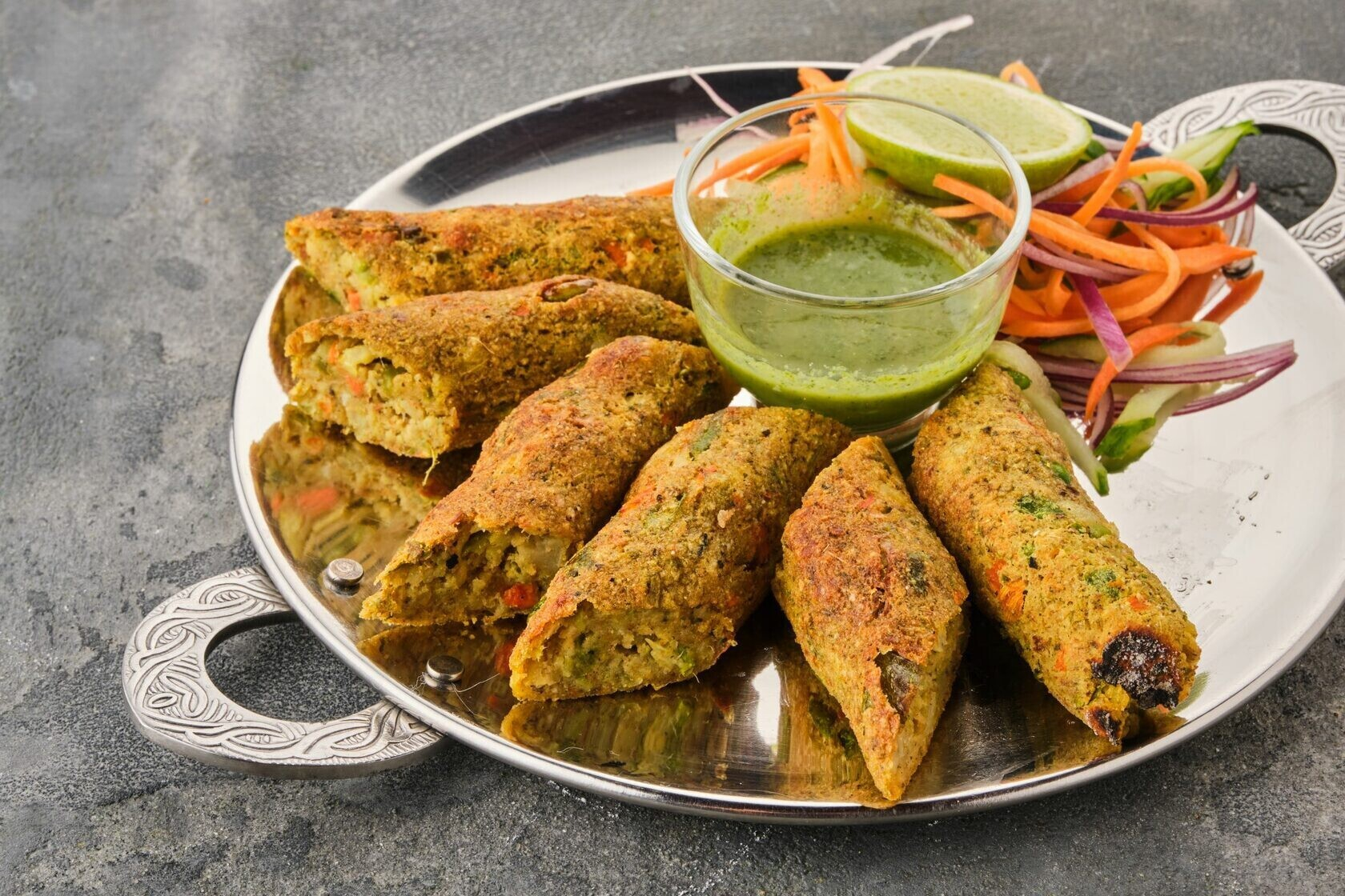 В категории закусок найдете домашний сыр в кляре из нутовой муки (8,2 руб.), индийские картофельные котлеты (7,9 руб.) или пикантную закуску из соленого печенья с йогуртом, тамариндовым и мятным соусами, нутом, машем и вареным картофельным (8,5 руб.).
