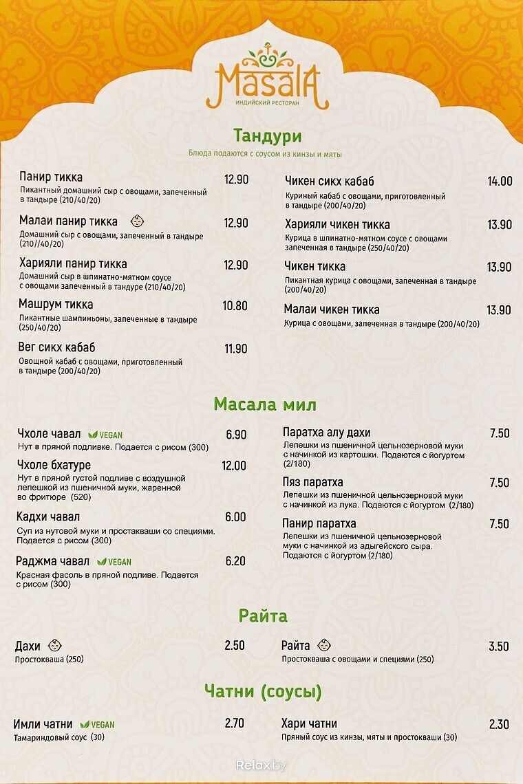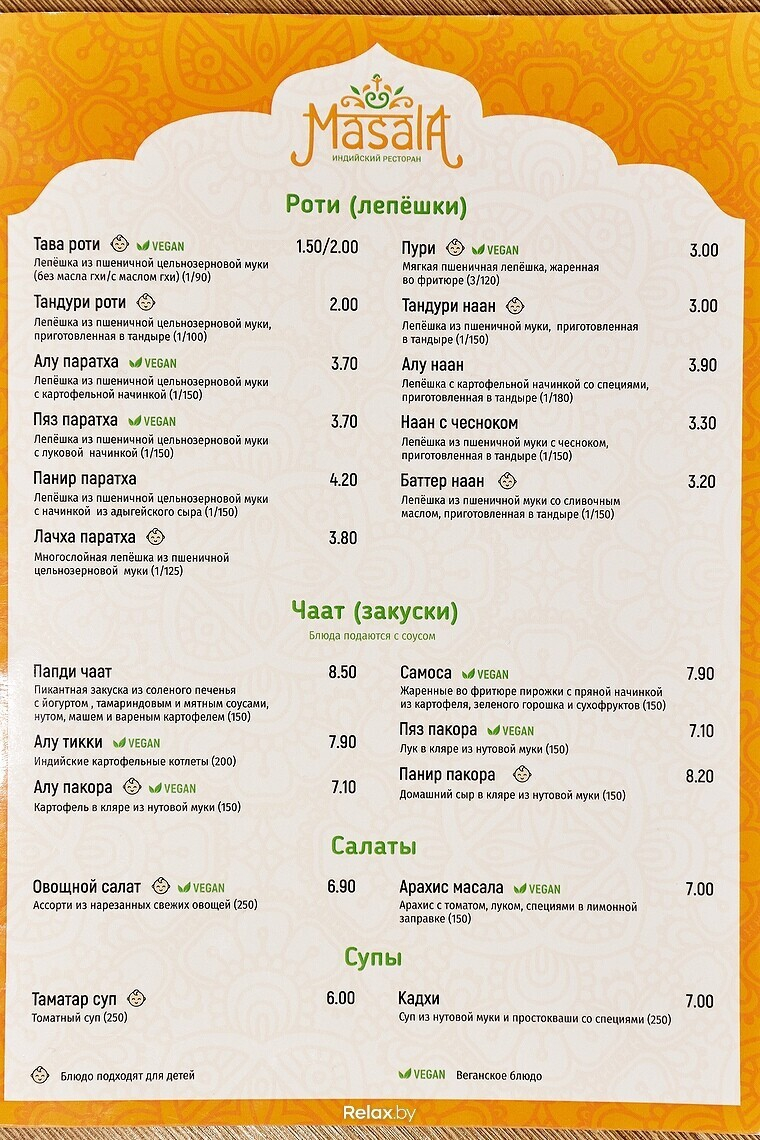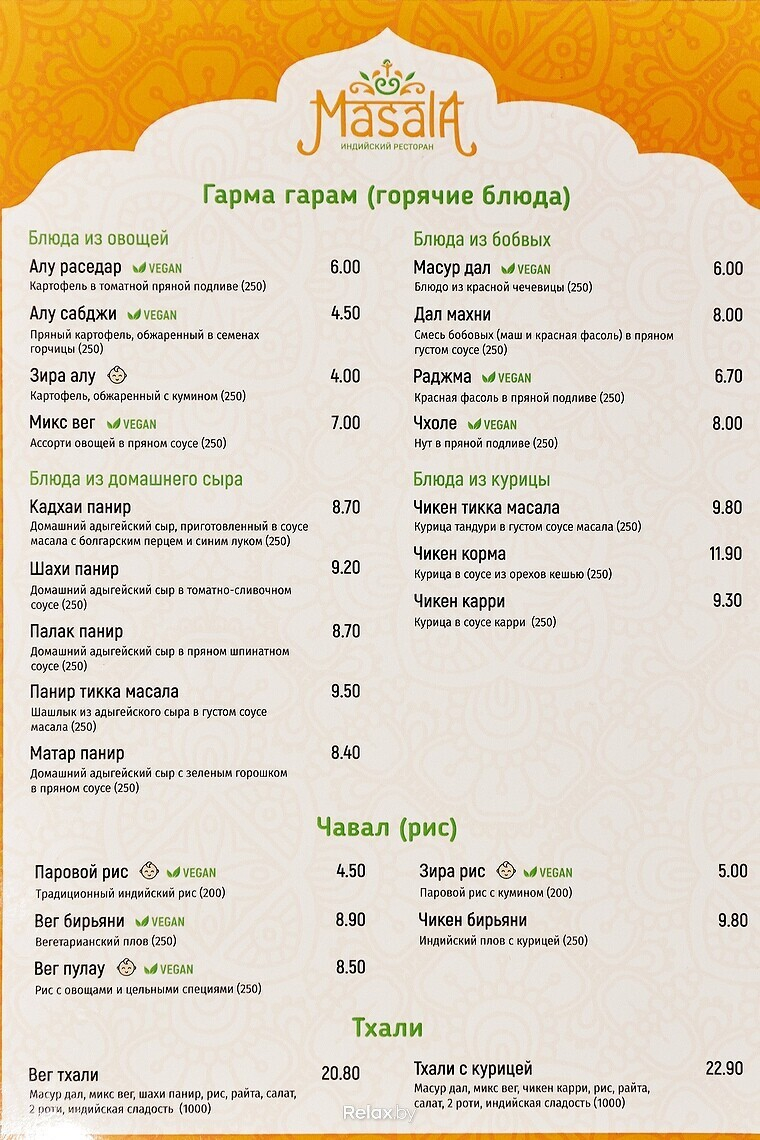 Из горячих блюд обратите внимание на варианты с домашним сыром. Так адыгейский сыр готовят в соусе масала с болгарским перцем и синим луком (8,7 руб.), в пряном шпинатном соусе (8,7 руб.), с зеленым горошком в пряном соусе (8,4 руб.) и др. Примечательно, что блюда для детей в меню отмечены специальным знаком.