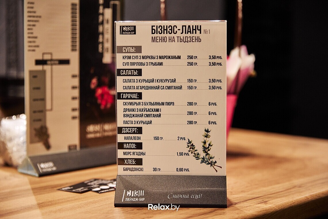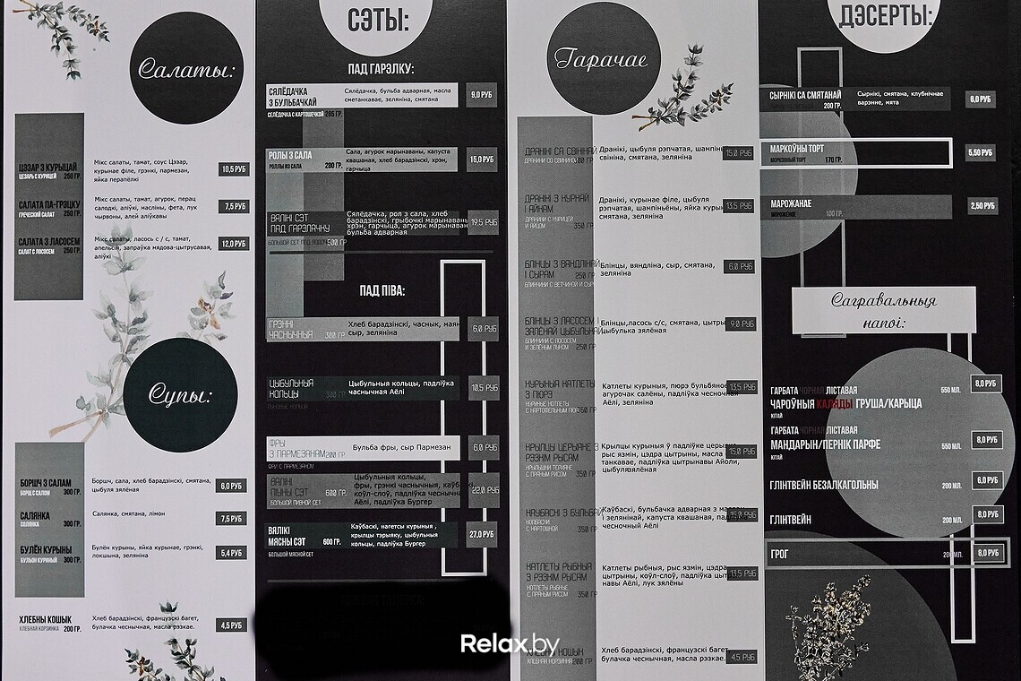 Как мы заметили выше, все меню в заведении на родном языке. С большего знакомые и понятные позиции из белорусской и европейской кухонь. Классические салаты («Цезарь», «Греческий», «Салат с лососем») подают до 12 руб., супы — до 7,5 руб. Отдельно представлены позиции «Пад гарэлку»: селедочка с картошкой (9 руб.), роллы из сала (15 руб.), большой сет под водку (19,5 руб.). Из горячих блюд отметим драники со свининой (15 руб.), блины с говядиной и сыром (6 руб.), колбаски с картошкой (15 руб.) и рыбные котлеты с рисом (13,5 руб.).