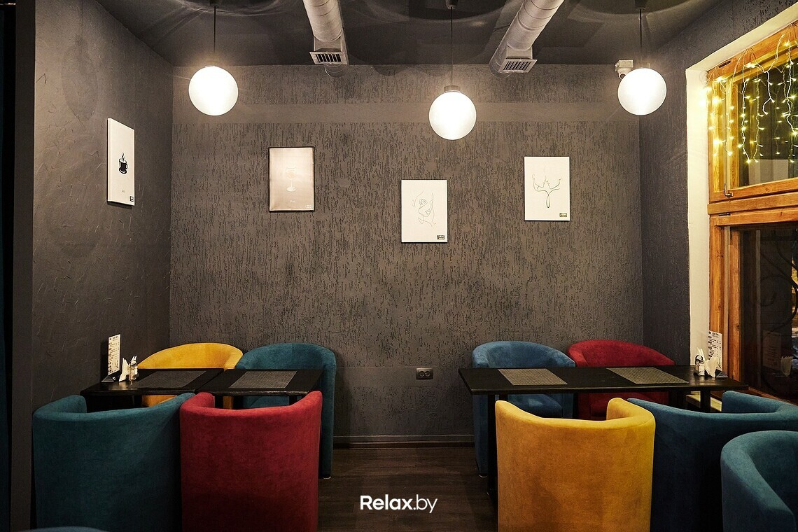 Заведение получилось небольшим, но достаточно уютным. В интерьере намеки на лофт и монохром, из ярких вкраплений — цветная мебель. Вечером здесь приглушают свет, а вот днем, благодаря окнам вдоль зала, в кафе достаточно светло.