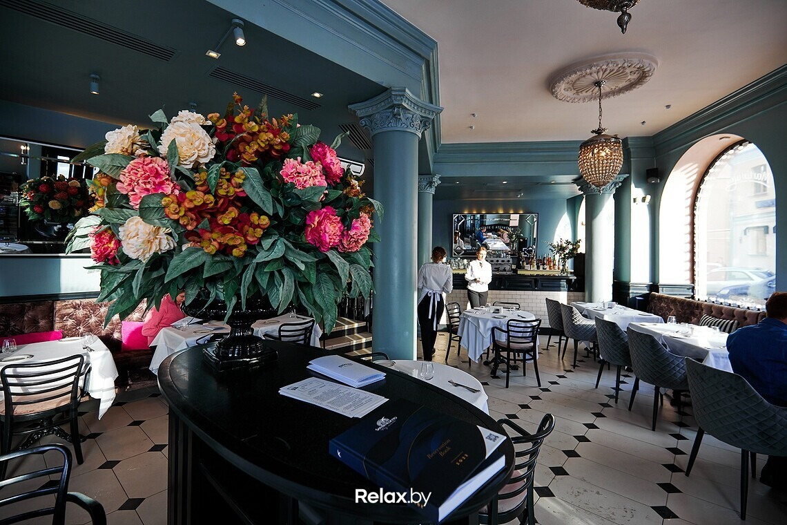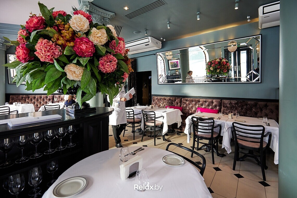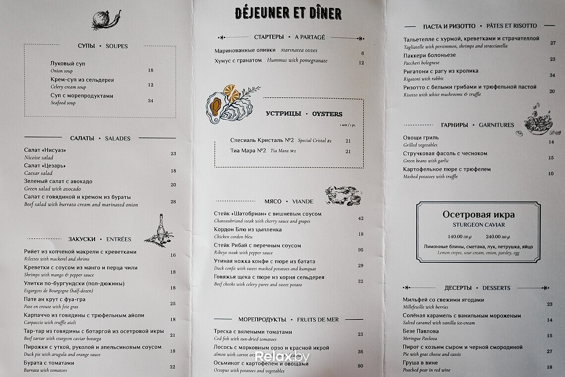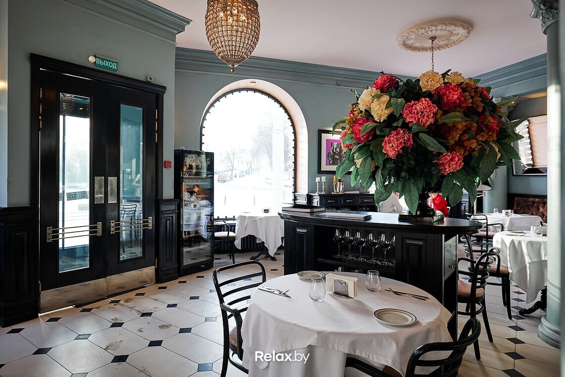 А в меню кардинальных обновлений достаточно, хотя общее гастрономическое настроение с намеком на Францию здесь также постарались сохранить. Одной из визитных карточек заведения называют утиную ножку конфи с пюре из батата и кумкватом (29 руб.). Также рекомендуем обратить внимание на тартар из говядины с боттаргой из осетровой икры и маринованным дайконом (21 руб.) и фаворит среди гостей — мильфей со свежими ягодами (23 руб.).