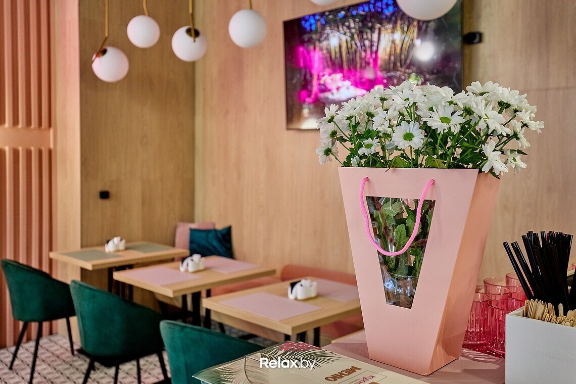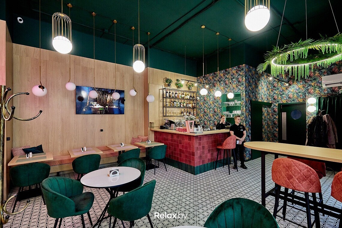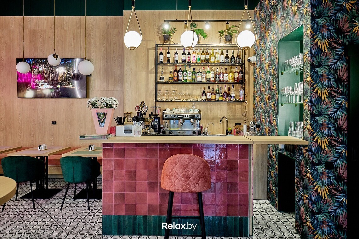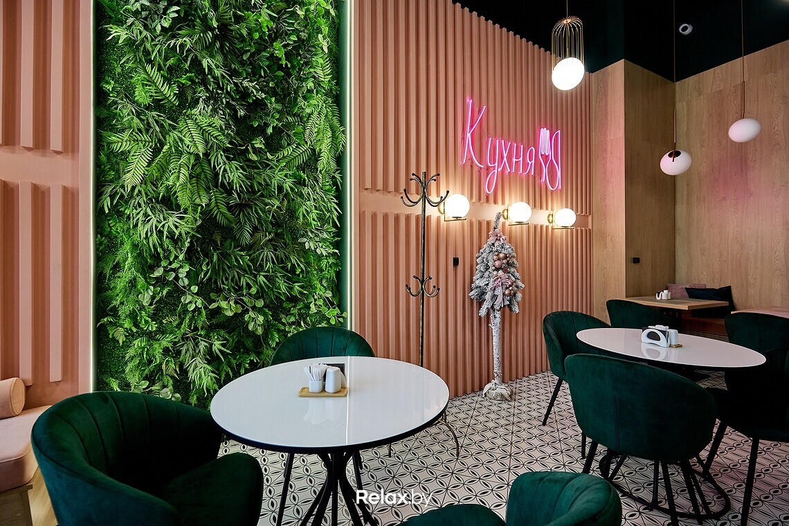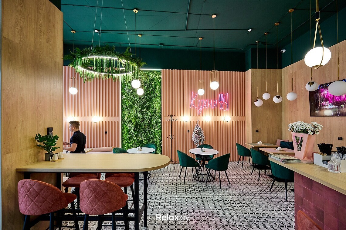 Заведение получилось предельно компактным, примерно на 20 посадочных мест. В интерьере, кажется, собраны все тренды последних двух-трех лет: от неоновых надписей до стены из искусственной зелени. Пестрые обои, пудровые оттенки, латунные светильники. Получилось камерно, как и должно быть в «спальнике». Идеально для сонных завтраков или расслабленных ужинов, когда не захотелось готовить дома.