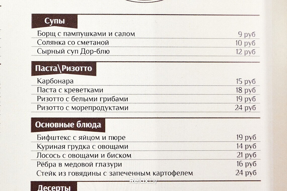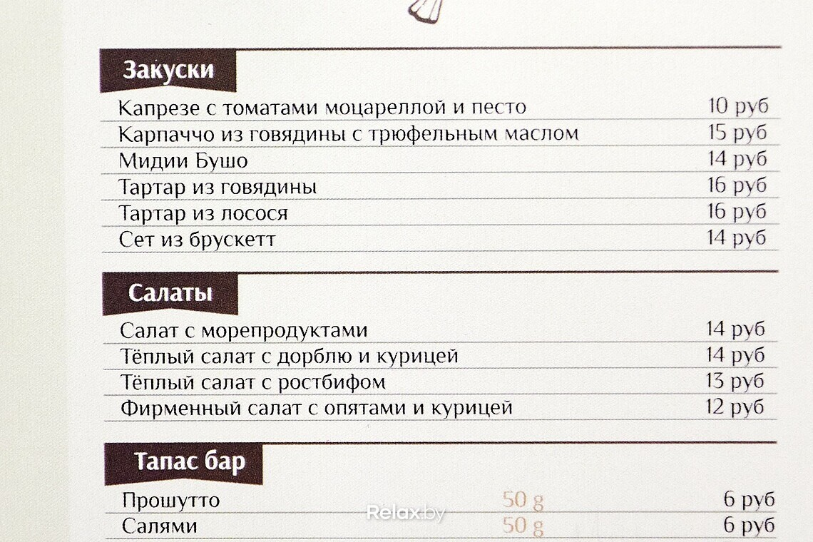 В меню есть завтраки, но пока не ранние: заведение работает с 10:00. Цены в основном меню не кусаются. С подборкой блюд решили не заморачиваться, собрав популярные европейские позиции. Так можно заказать карпаччо из говядины с трюфельным маслом (15 руб.), тартар из лосося (16 руб.), карбонару (15 руб.) или бифштекс с яйцом и пюре (19 руб.).