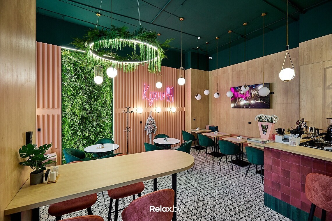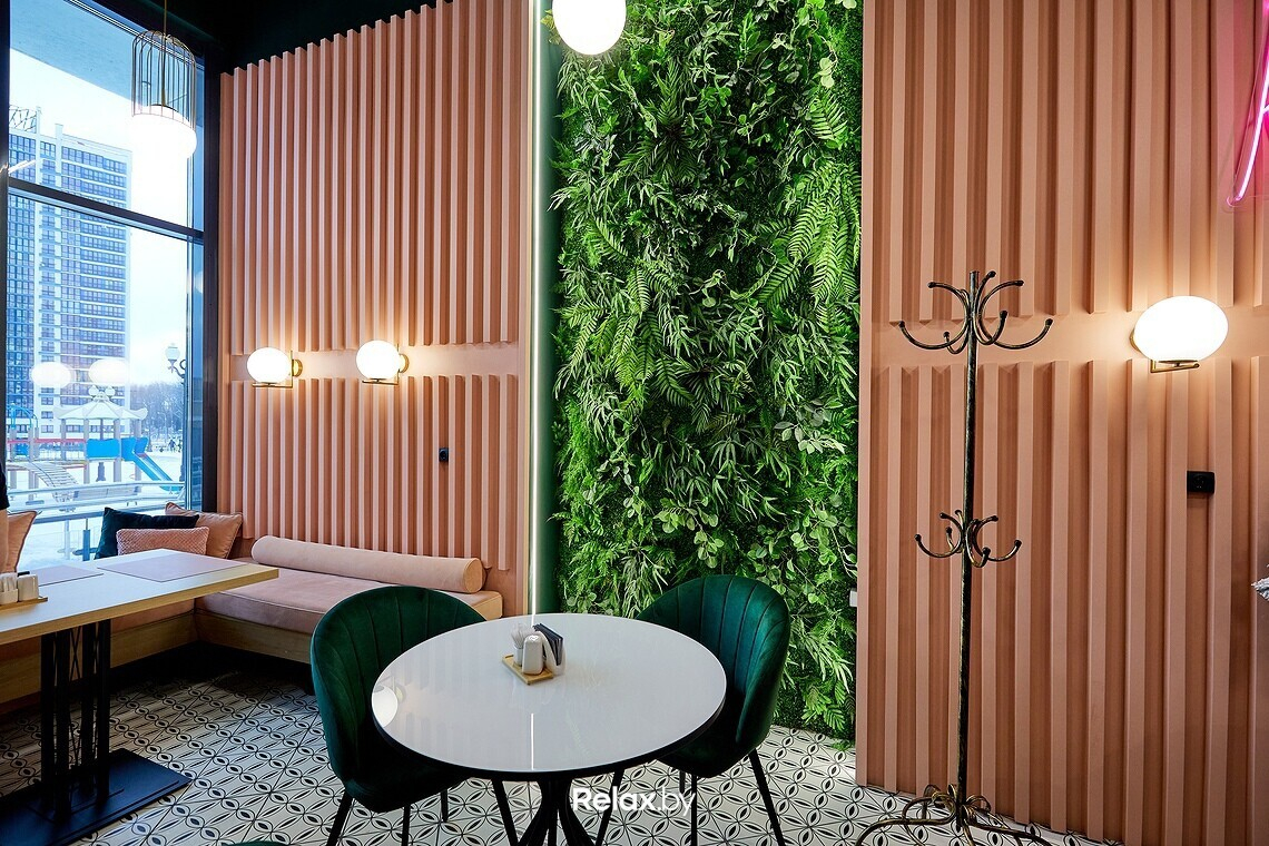 Заведение получилось предельно компактным, примерно на 20 посадочных мест. В интерьере, кажется, собраны все тренды последних двух-трех лет: от неоновых надписей до стены из искусственной зелени. Пестрые обои, пудровые оттенки, латунные светильники. Получилось камерно, как и должно быть в «спальнике». Идеально для сонных завтраков или расслабленных ужинов, когда не захотелось готовить дома.