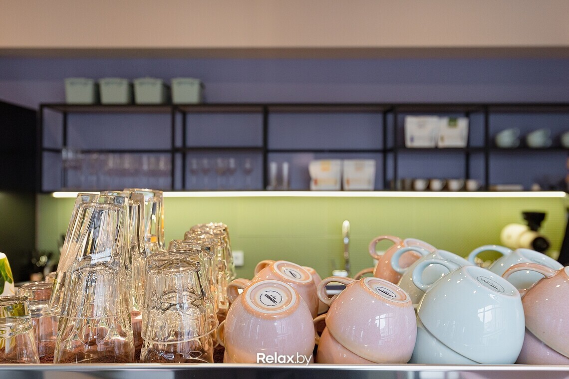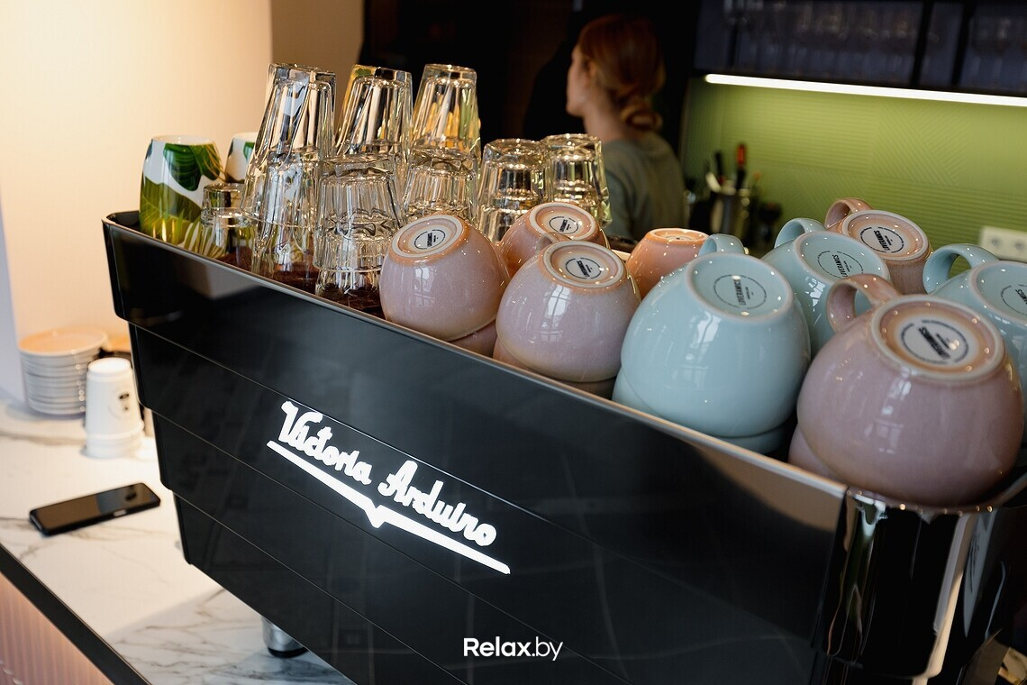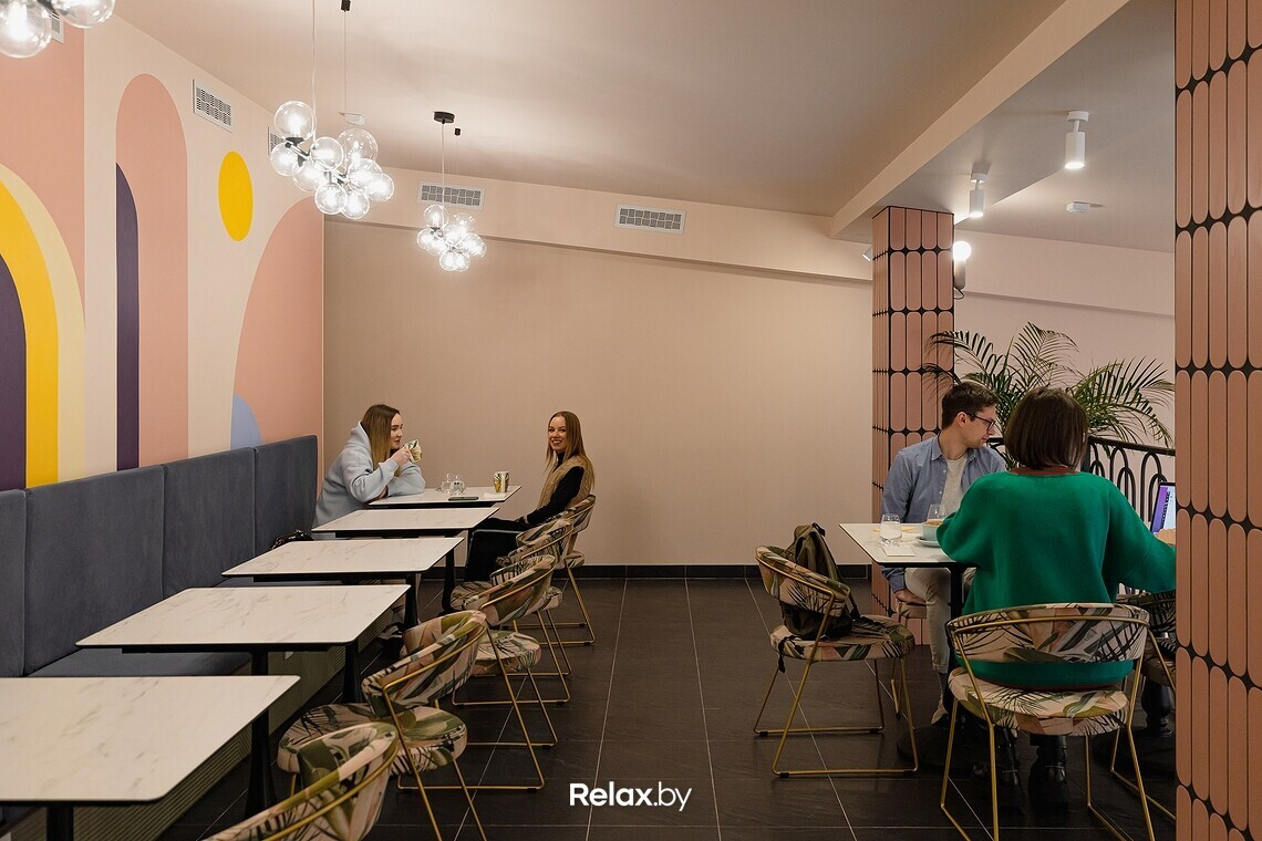 Интерьер выполнен в общей стилистике сети, но на этот раз без отсылок к старине, как это получилось в уютной кофейне в Осмоловке. Наш любимый прием — высокие потолки и большие панорамные окна, наполняющие зал дневным светом. Трендовая цветовая гамма: пудровые оттенки в сочетании с латунными элементами. Последний штрих — грамотная точечная подсветка, много зелени и удобное зонирование. В общем, просто и со вкусом.