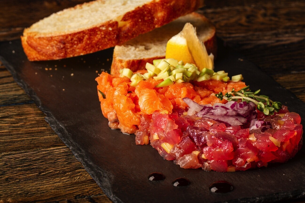 Тартар из тунца и лосося с авокадо и манго — 19 руб.;