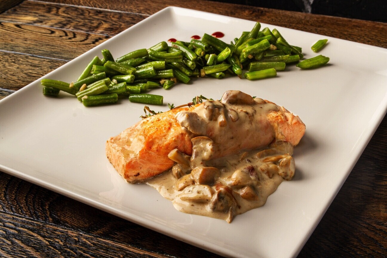 Лосось в грибном соусе из белого вина со стручковой фасолью — 24 руб.;