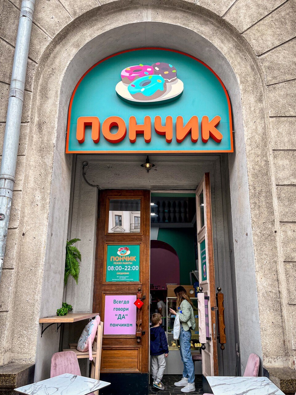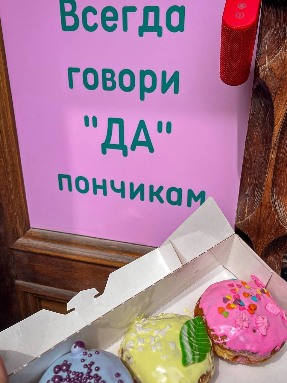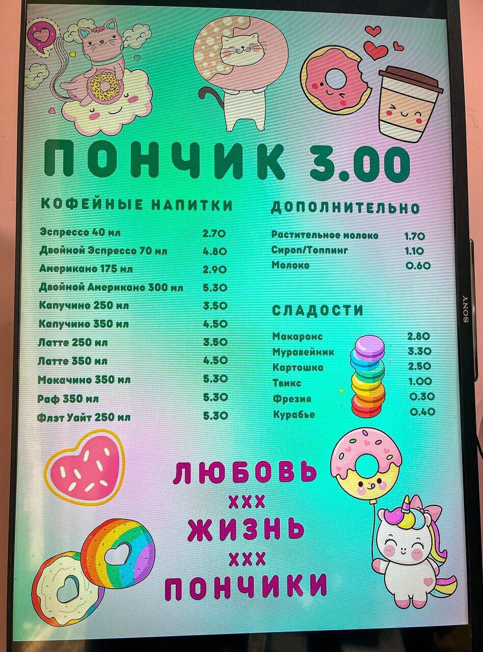 Яркая вывеска намекает на формат «зашел-купил-вышел». Жарят пончики на месте, используя большой бесконтактный фритюр. Готовят здесь именно берлинский пончик, в основе которого дрожжевое тесто, начинка в виде джема или крема и глазурь. Стоимость фиксированная: 3 рубля за одну штуку.