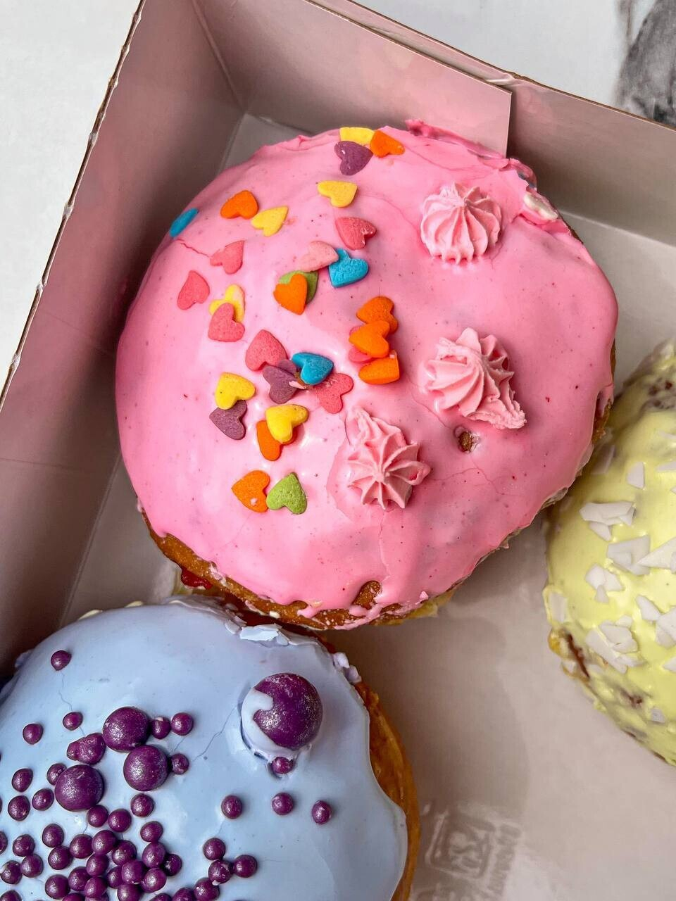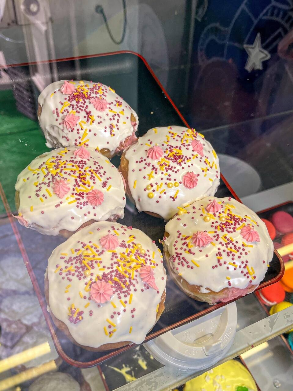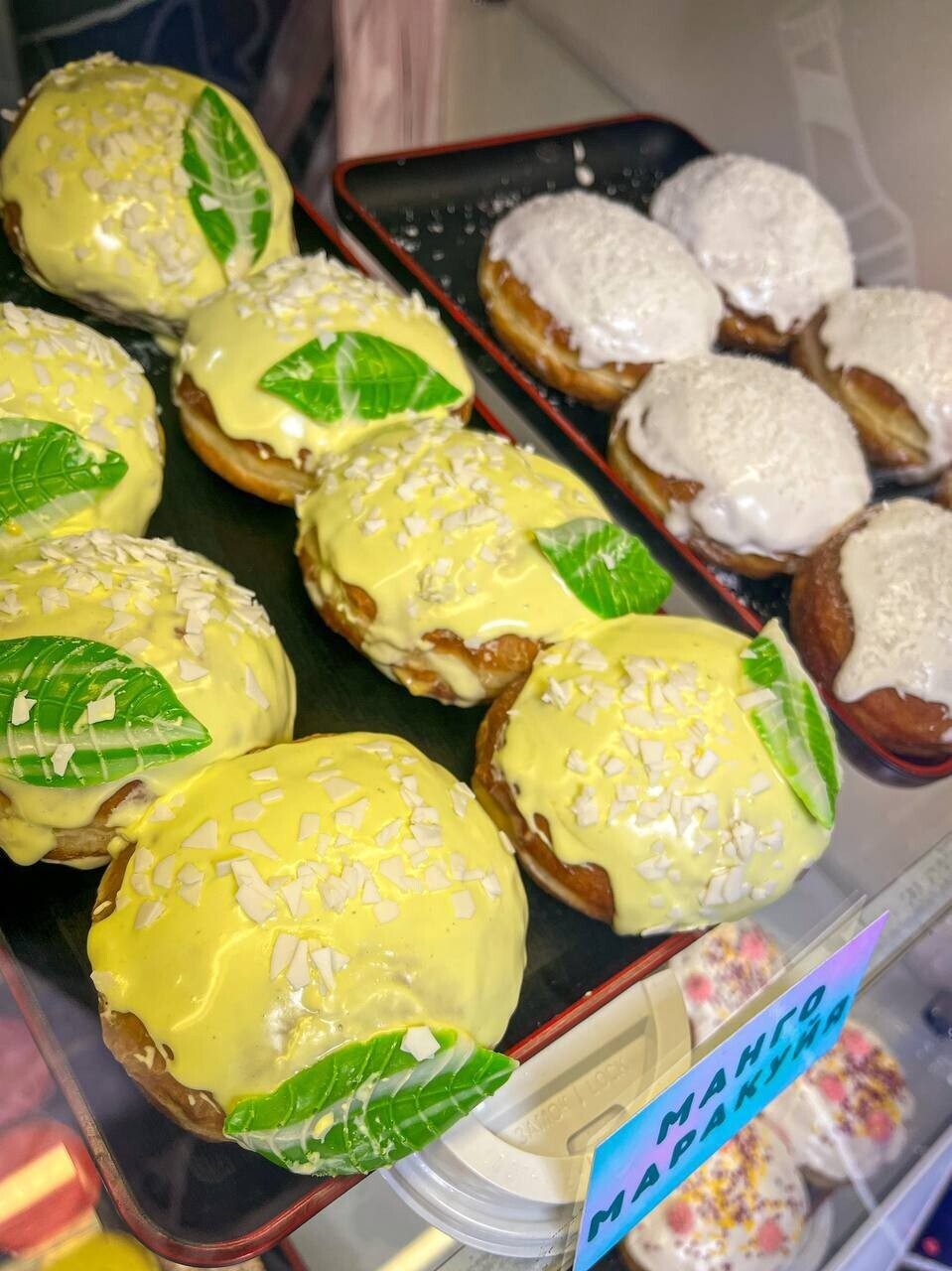 Яркая вывеска намекает на формат «зашел-купил-вышел». Жарят пончики на месте, используя большой бесконтактный фритюр. Готовят здесь именно берлинский пончик, в основе которого дрожжевое тесто, начинка в виде джема или крема и глазурь. Стоимость фиксированная: 3 рубля за одну штуку.