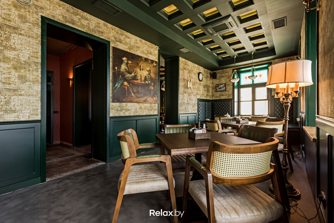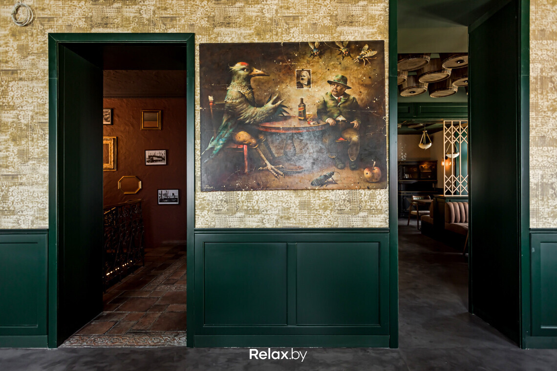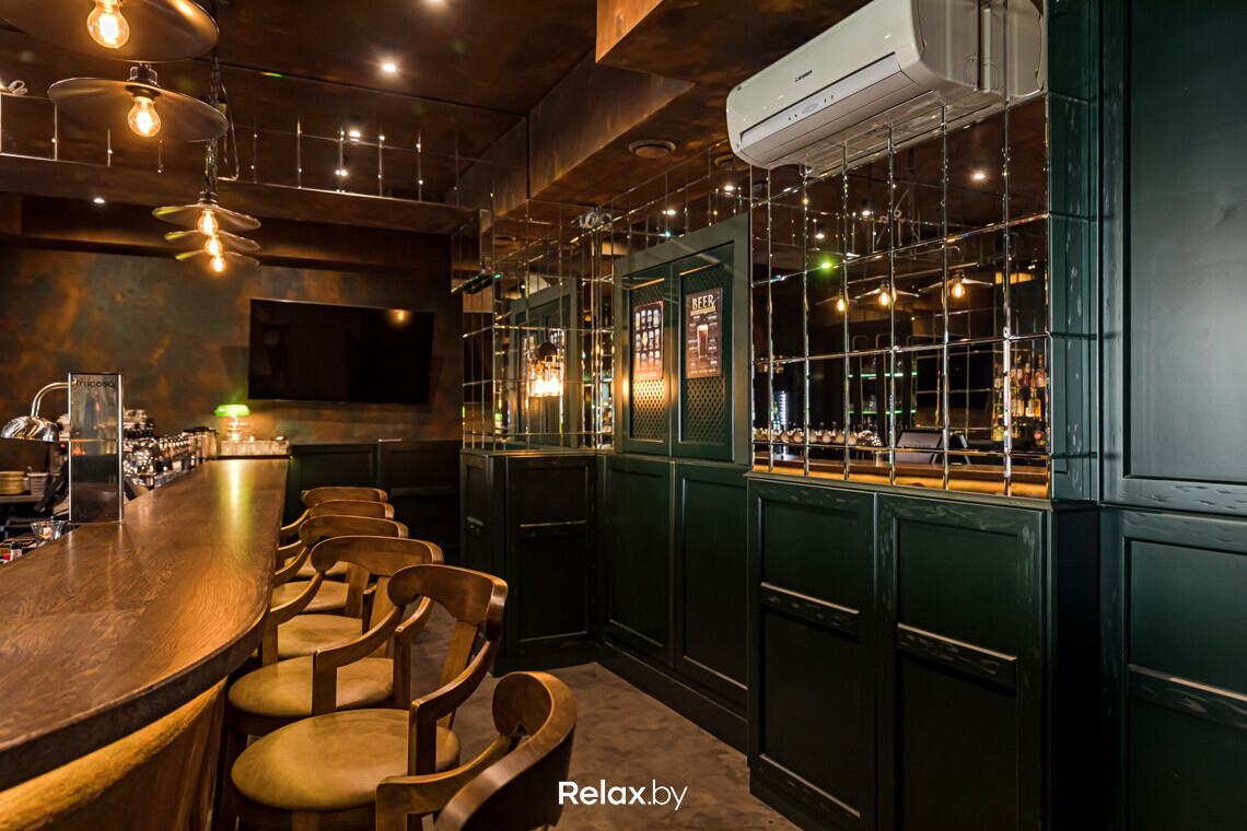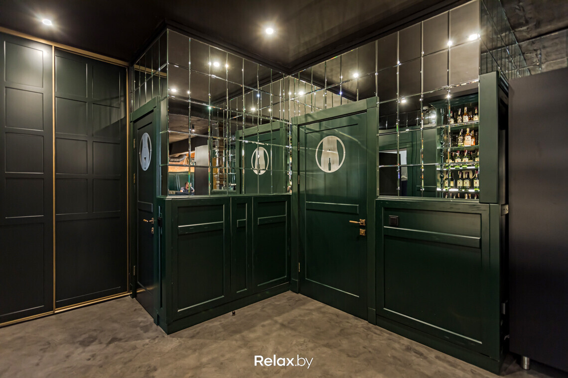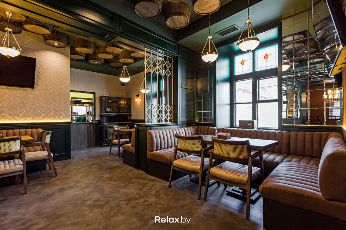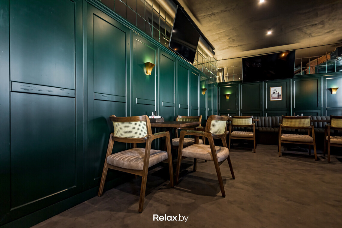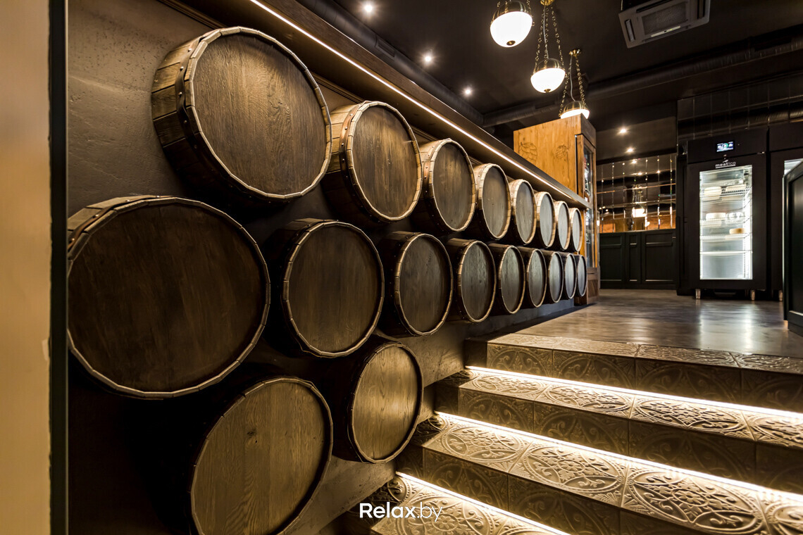 В каждом зале есть свои фишки. Например, настоящие бочки, использованные на барной стойке и на потолке верхнего зала. Отдельное внимание — насыщенному зеленому оттенку панелей на стенах в сочетании с фацетными зеркалами над ними. Такой прием трансформирует пространство и отражает обилие бликов от светильников.