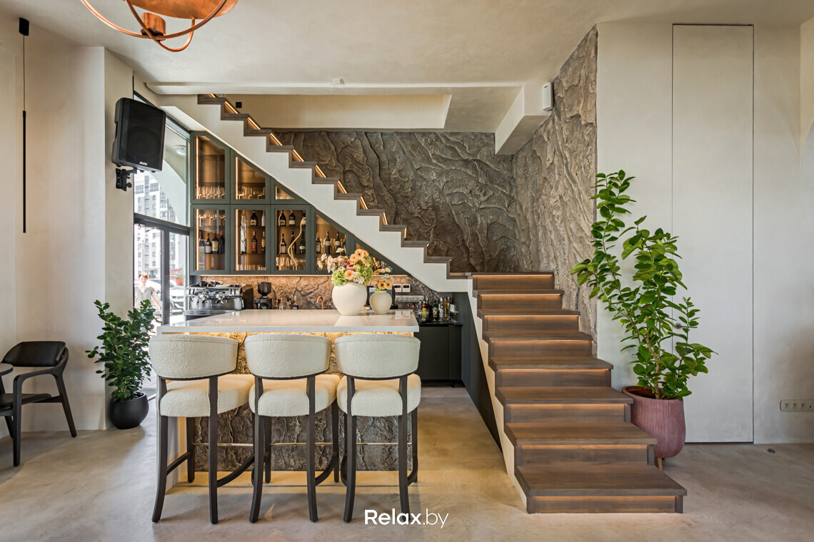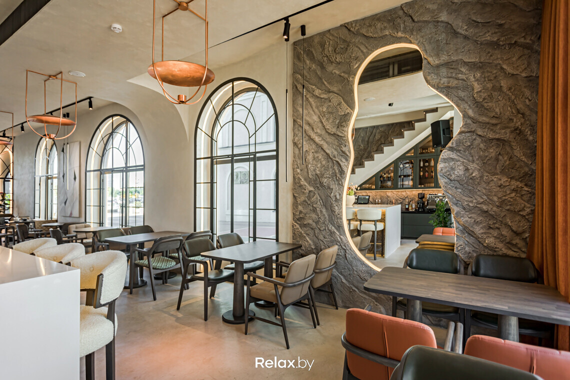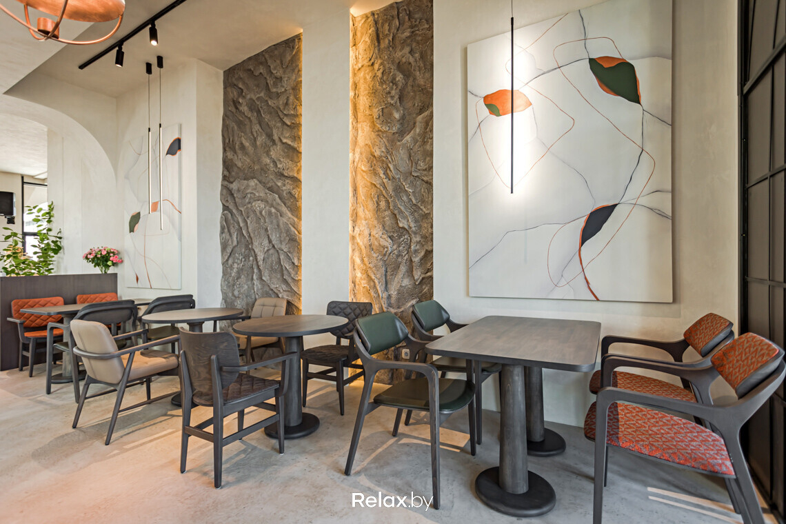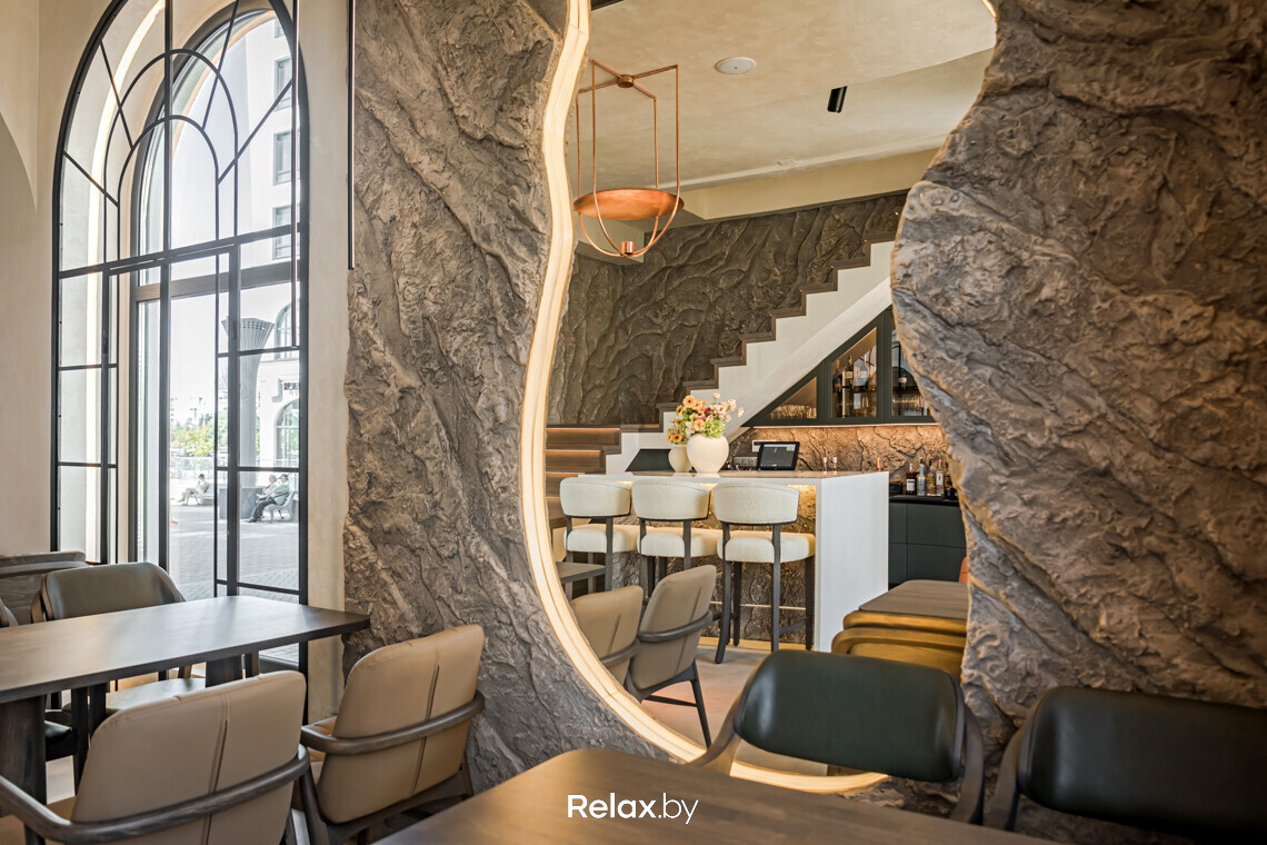 Ставка в дизайне сделана на натуральность и тактильность. Притом ко всему в зале мастера приложили руку в прямом смысле этого слова: ручной труд присутствует почти в каждой детали. Так «скалы» на стенах вытачивал минский художник, а пол не наливной, как на первый взгляд может показаться, а художественный (а это тоже синоним кропотливого труда!).