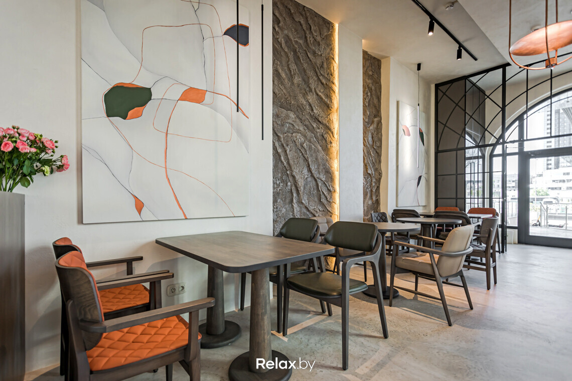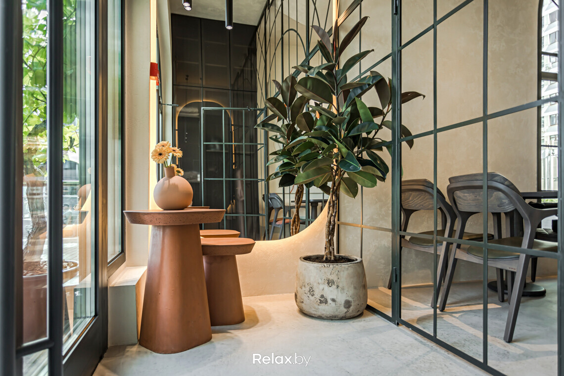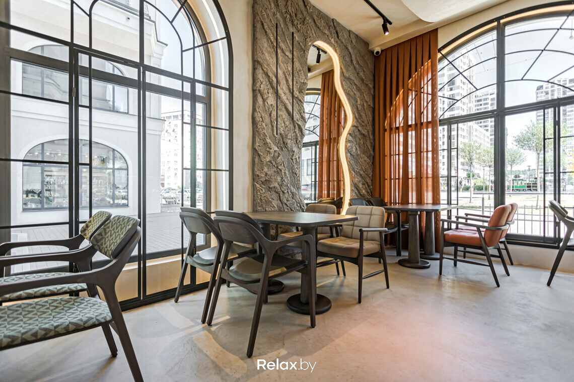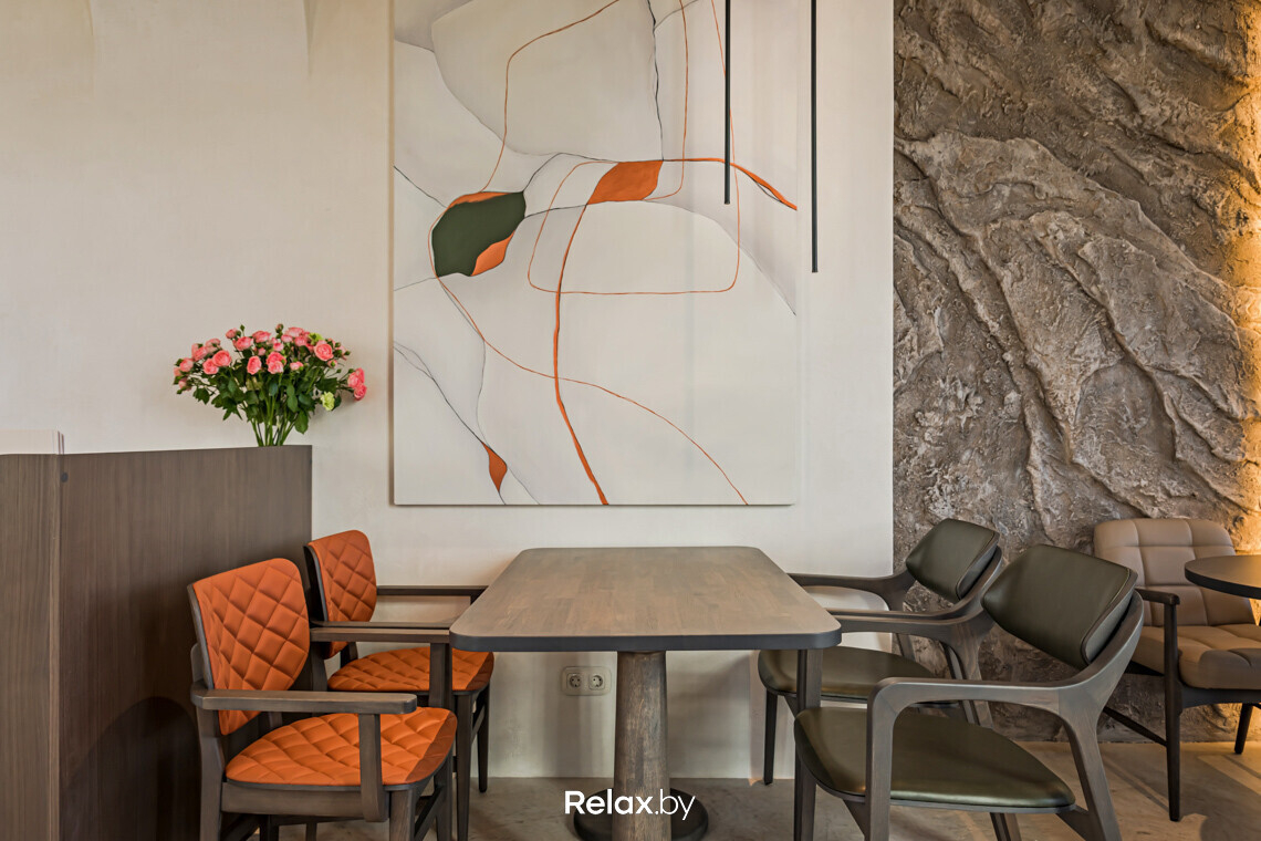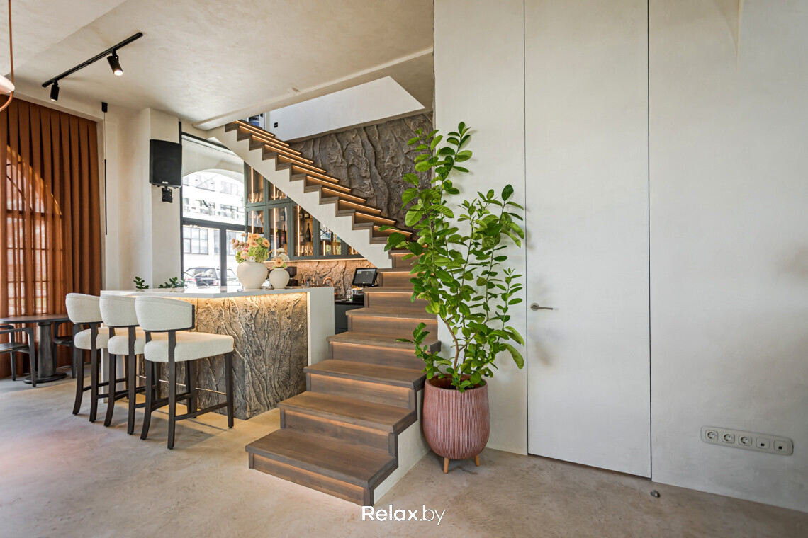 Ставка в дизайне сделана на натуральность и тактильность. Притом ко всему в зале мастера приложили руку в прямом смысле этого слова: ручной труд присутствует почти в каждой детали. Так «скалы» на стенах вытачивал минский художник, а пол не наливной, как на первый взгляд может показаться, а художественный (а это тоже синоним кропотливого труда!).