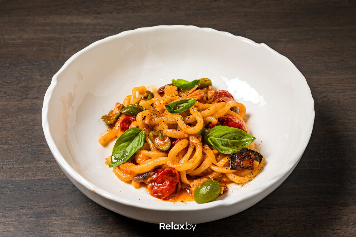 Что же касается пасты, то она у нас исключительно ручной работы. Есть, например, тосканский вид пичи, шпинатная, тальятелле и короткая паста. Равиоли также готовим сами. Вечерами любой желающий может увидеть процесс раскатывания на зале.