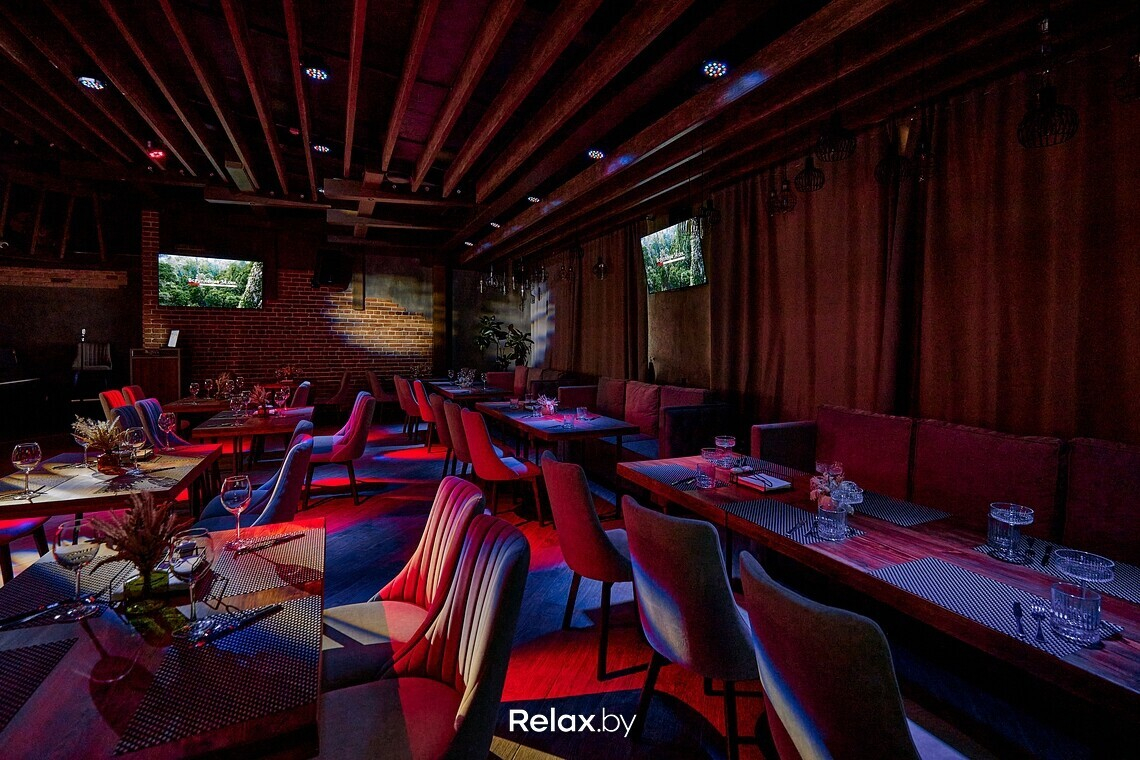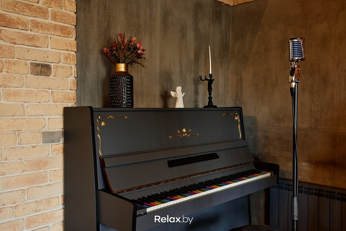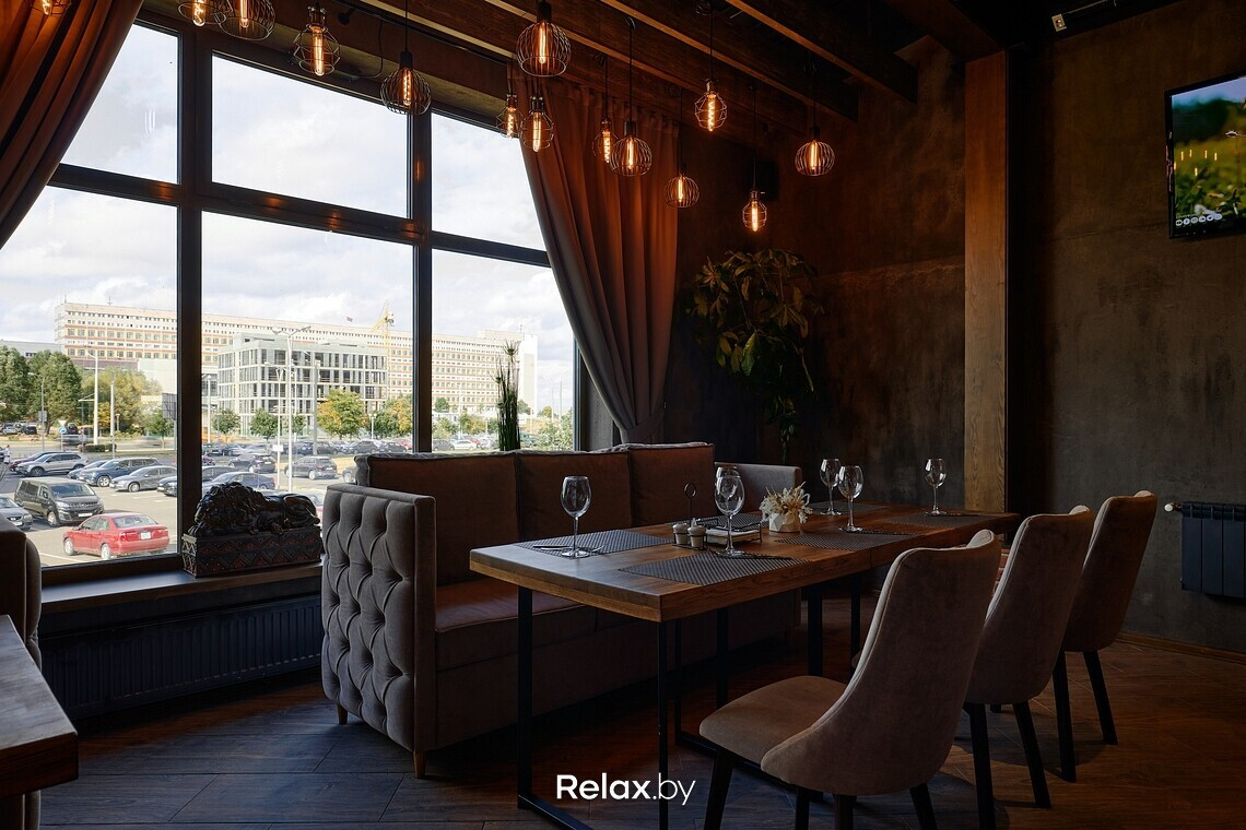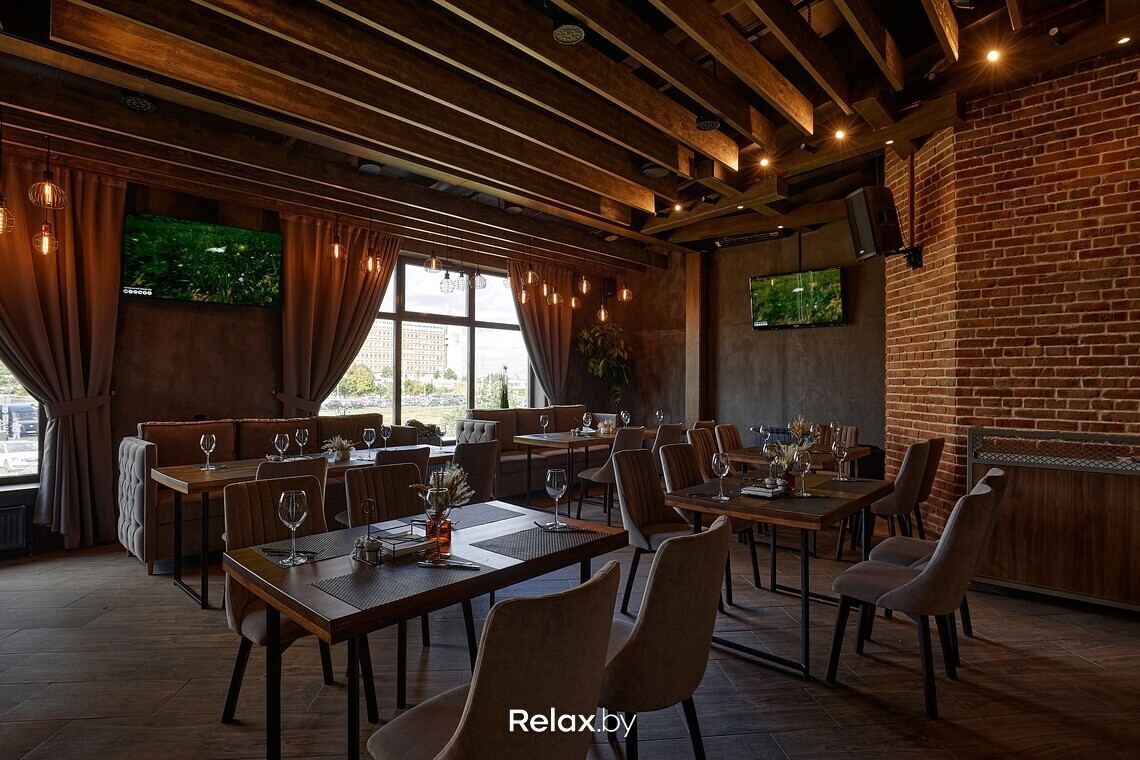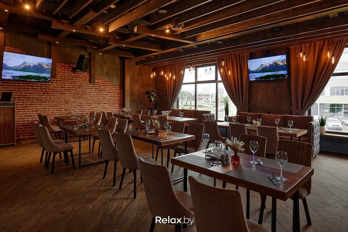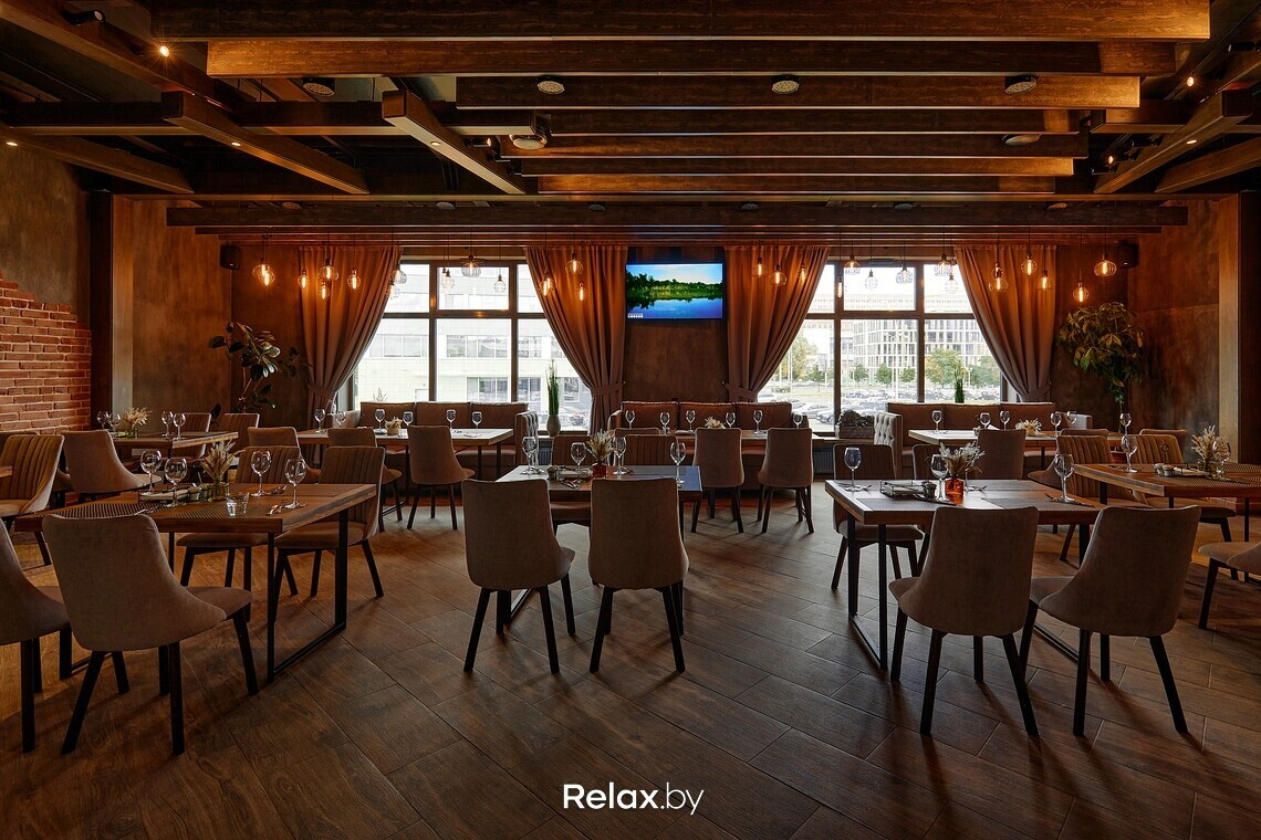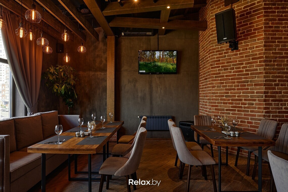 Зал получился по-ламповому теплым: главным в интерьере выбрали глубокий коричневый. Ощутимо, что вдохновлялись здесь стилем лофт: оголенные балки, характерные для этого стиля светильники, красный кирпич и фрагменты бетонных стен. Из акцентов, цепляющих взгляд, — креативно стилизованное фортепиано. «Сглаживают» лофт тактильные мягкие ткани, тяжелые гардины, зелень. Приятно, что заведение залито дневным светом: здесь панорамные окна.