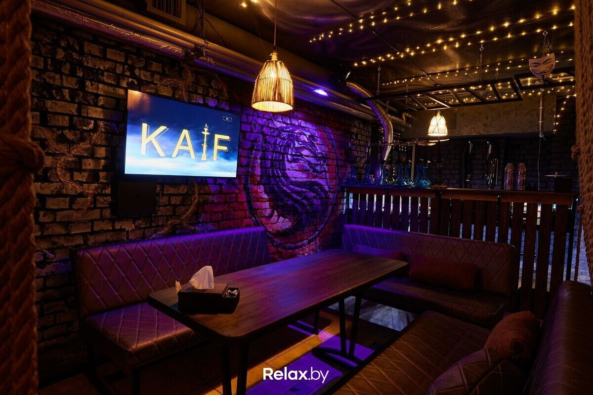 Специальные предложения: именинникам скидка 20% на кухню и бестабачный кальян, а также поздравление от команды KAIF. Действует 4 дня до и 4 дня после даты. Также подписчикам в Инстаграм при отметке профиля в сторис и отзыве в Гугл и Яндекс с вс. по чт. с 17:00 до 19:00 скидка на кальян и кухню 20%.