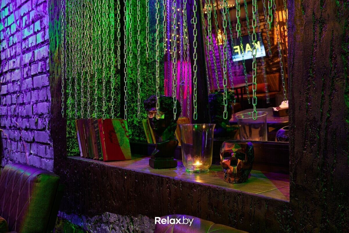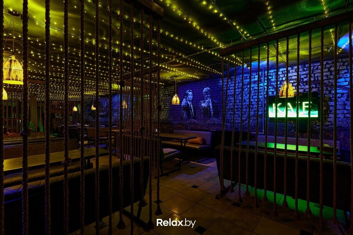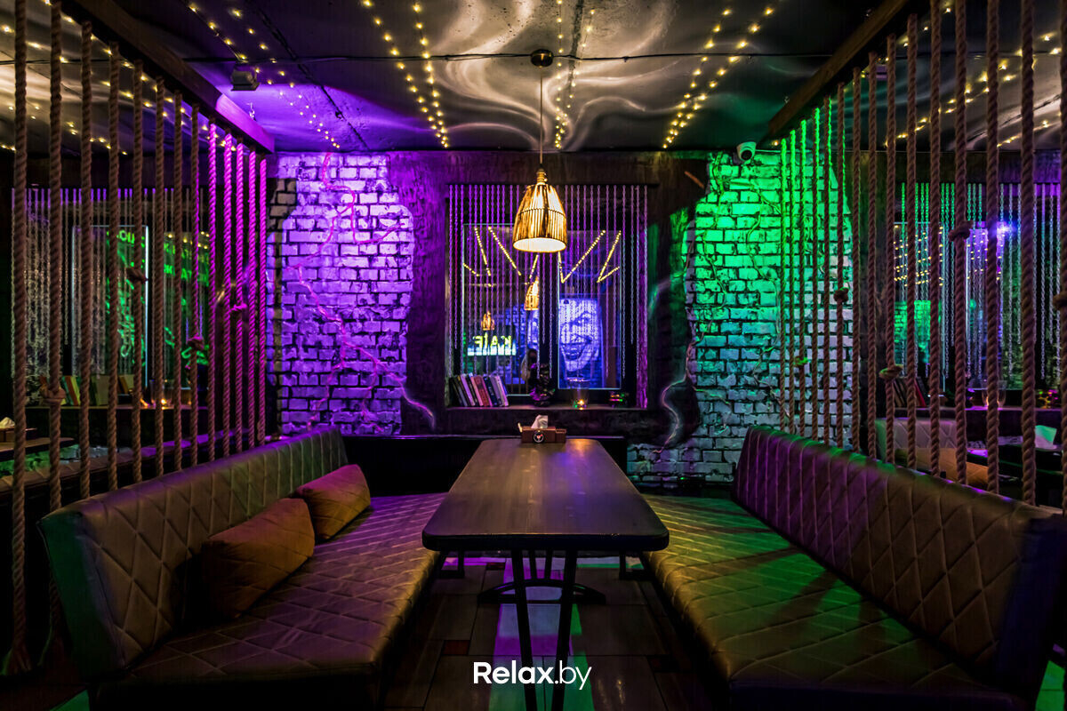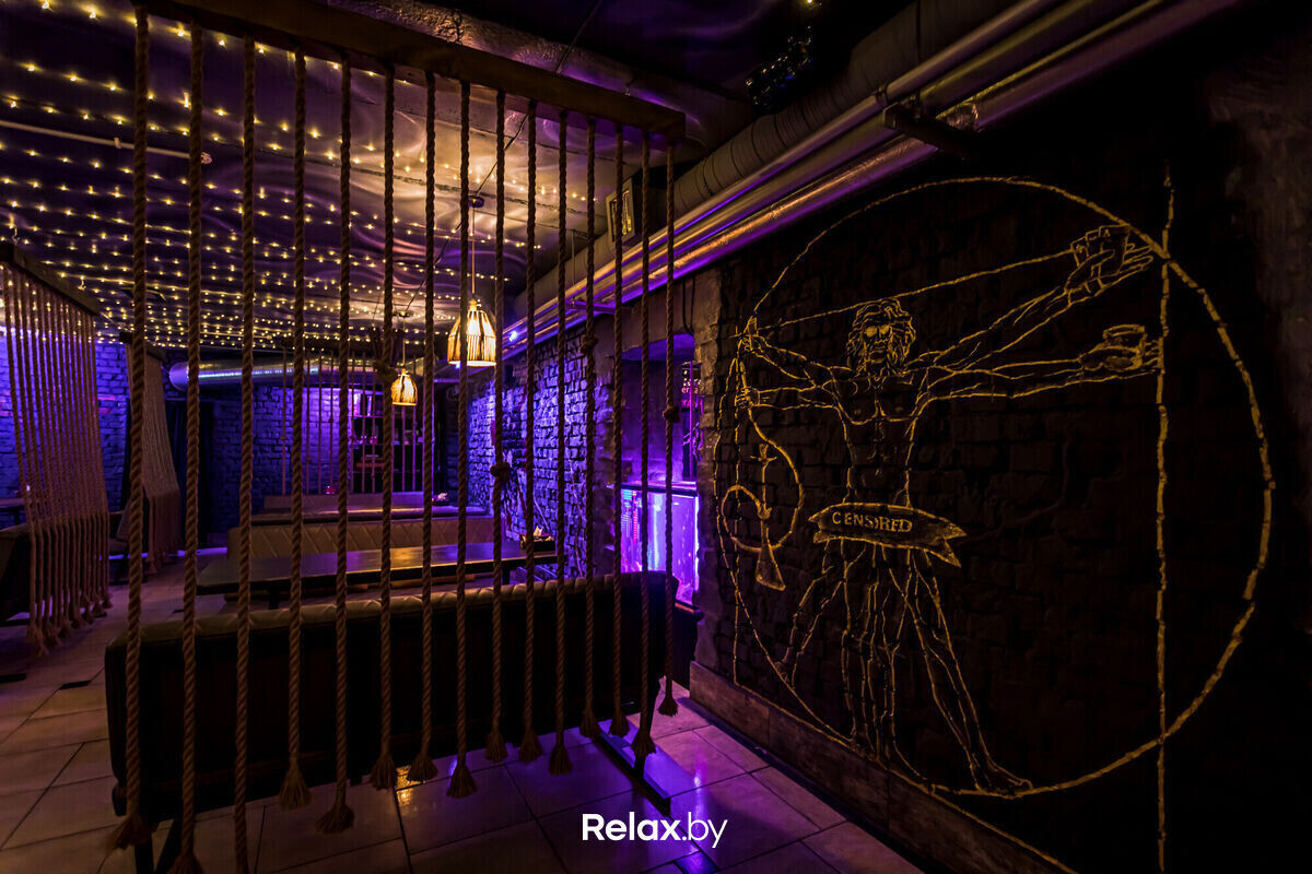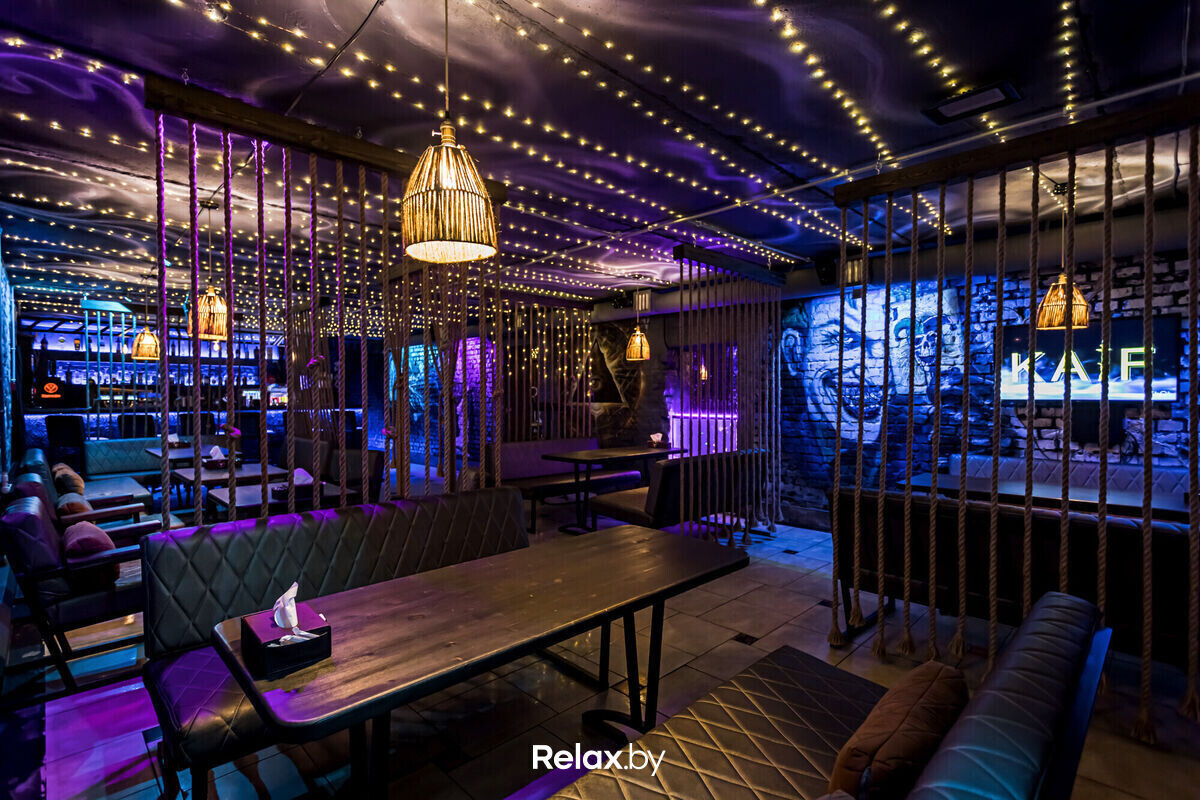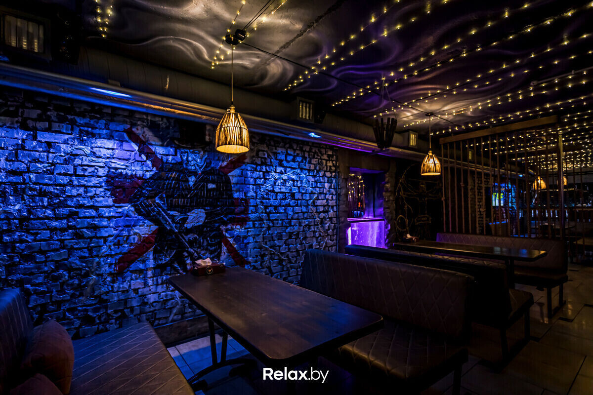 Стены расписаны известным минским художником, в общей сложности выполнено более 20 (!) работ. Практически каждый столик зонирован декоративными канатами. Также есть несколько столов, которые можно полностью закрыть шторами.