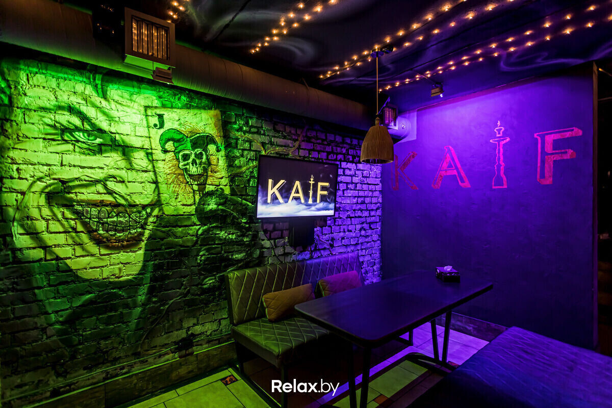 Работали над проектом достаточно долго — два года с учетом того, что помещение нуждалось в капитальном ремонте. Любопытно, что учредитель сам придумал и разработал дизайн. Благодаря специальной краске и освещению, стены заведения меняют цвет: вы приходите при одном освещении, отдыхаете при другом, а уходите при третьем. Также в KAIF есть аквариум с редкими видами светящихся рыб и водопад, благодаря последнему в залах присутствует расслабляющий звук падающей воды.