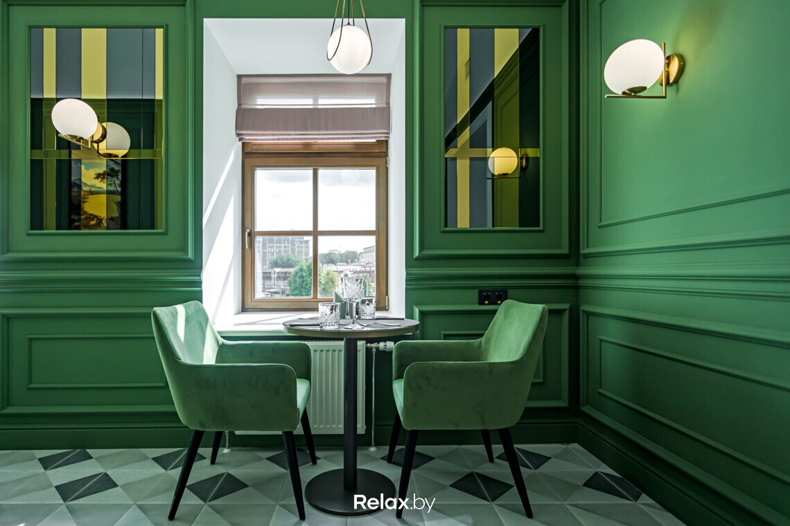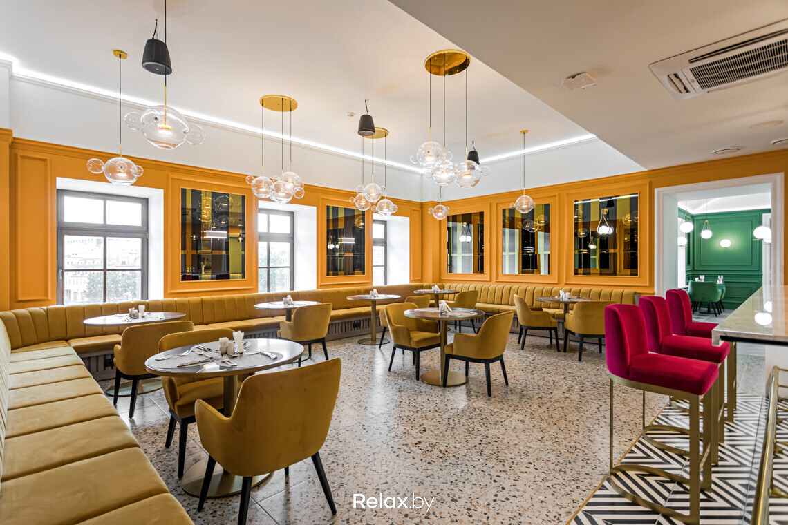 Условно разделить пространство можно на три зала. Яркий первый, который чаще всего выбирают для завтраков, камерный второй всего с одним столиком (идеально для свидания), и «вечерний» третий. Последний более затемненный, строгий, все с той прекрасной панорамой на старый центр — идеально для ужина. К слову, совсем рядом Большой театр оперы и балета, и если каждый раз вы думаете о том, куда же сходить на ужин поблизости — запоминайте это место!